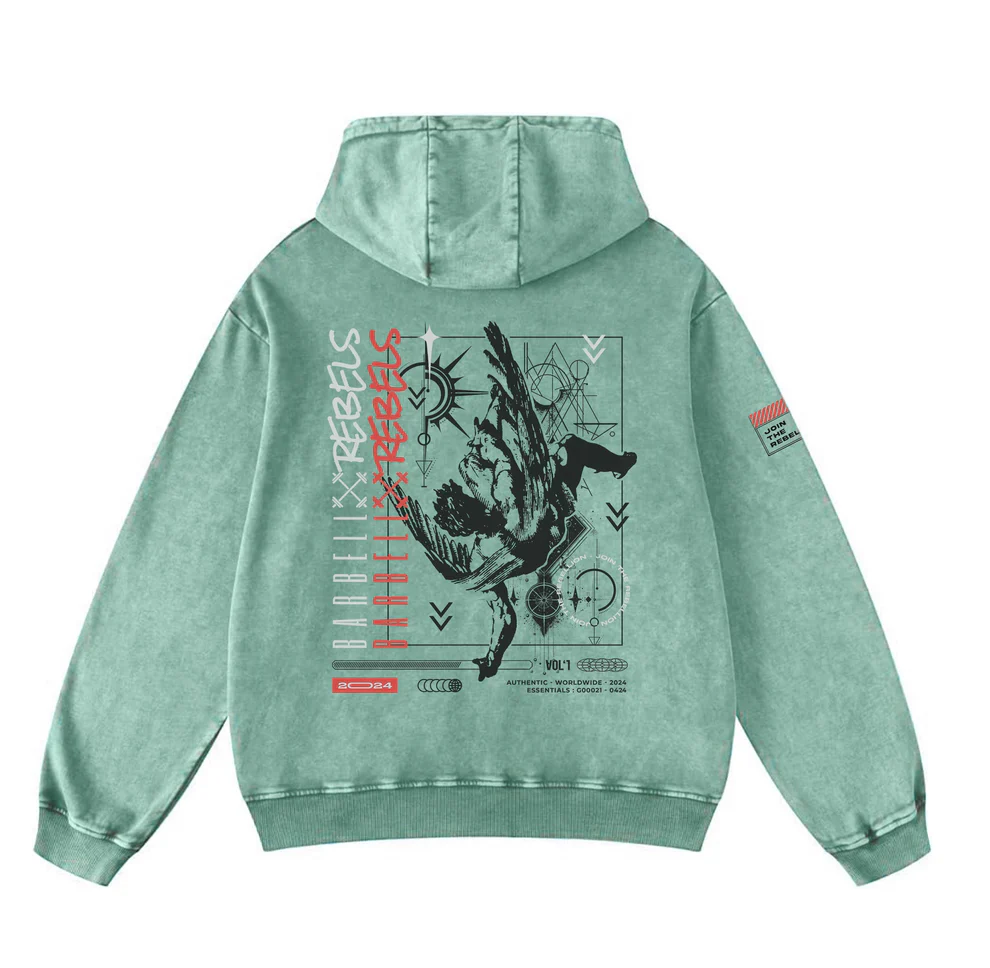 Hoodie unisexe oversized de BARBELL REBELS. Effet « vieilli » et illustration propre à chaque colori.