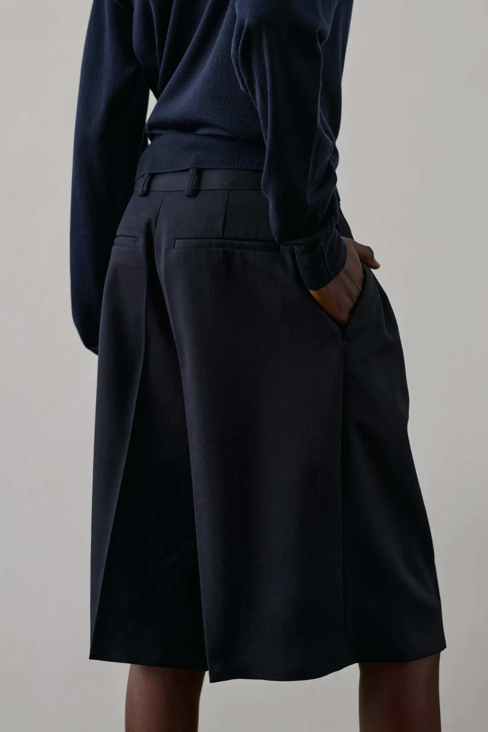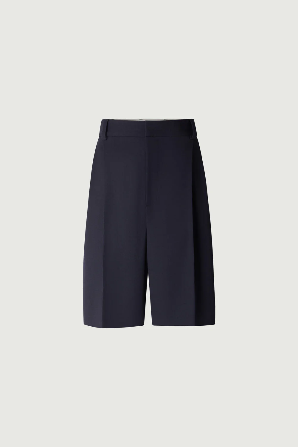 FOSTER est un bermuda en gabardine de laine bleu nuit. Ses jambes larges et ses plis marqués ajoutent du mouvement et du style. Les poches italiennes et la fermeture à crochet intérieur soulignent son allure sophistiquée.