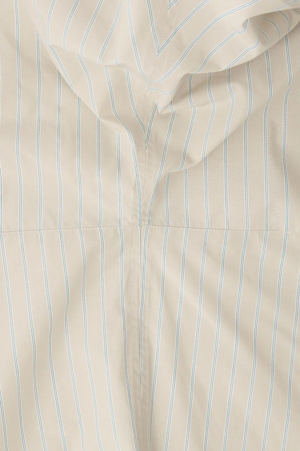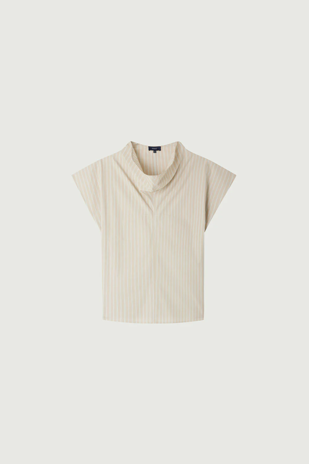 FARAH est une blouse sans manches en popeline de coton biologique rayée. Sa coupe droite et son col montant accentuent son élégance. Les surpiqûres subtiles et le jeu de construction signent l’identité Soeur, parfait pour un look estival raffiné.