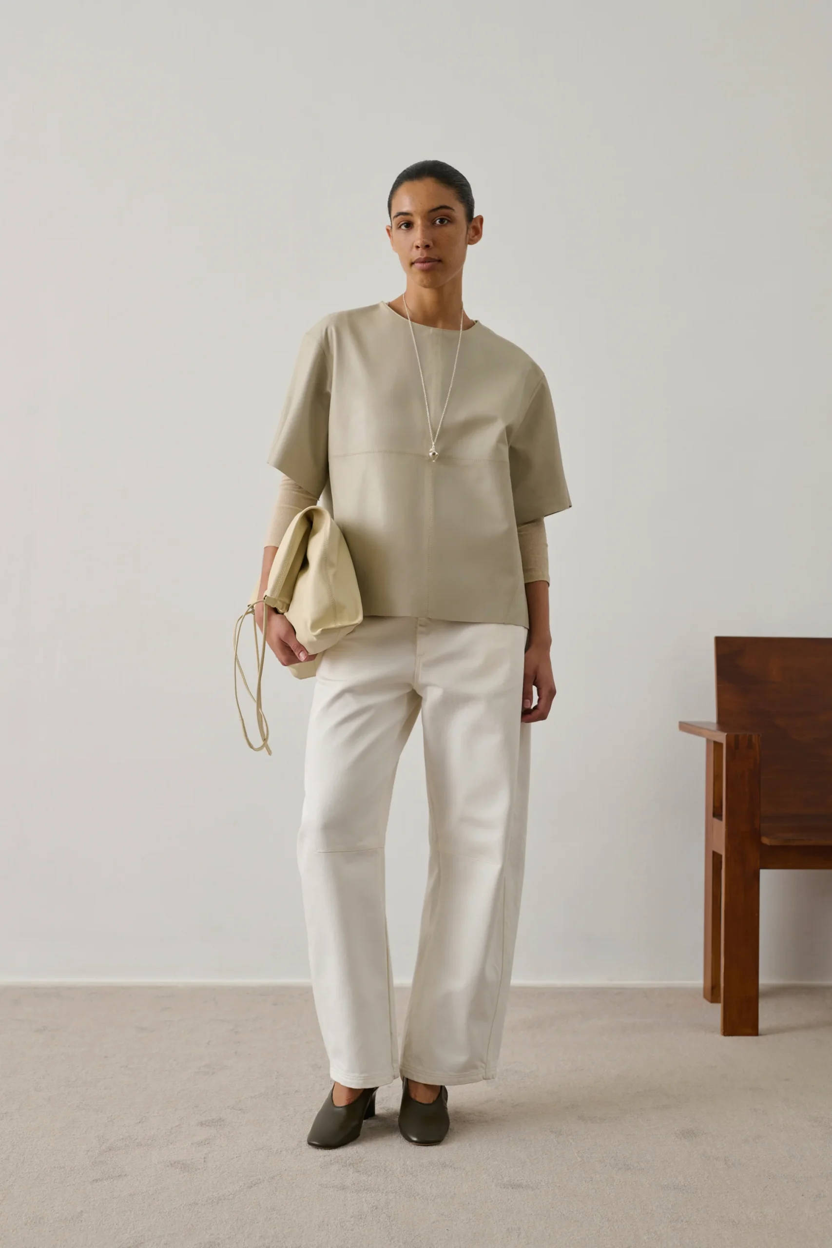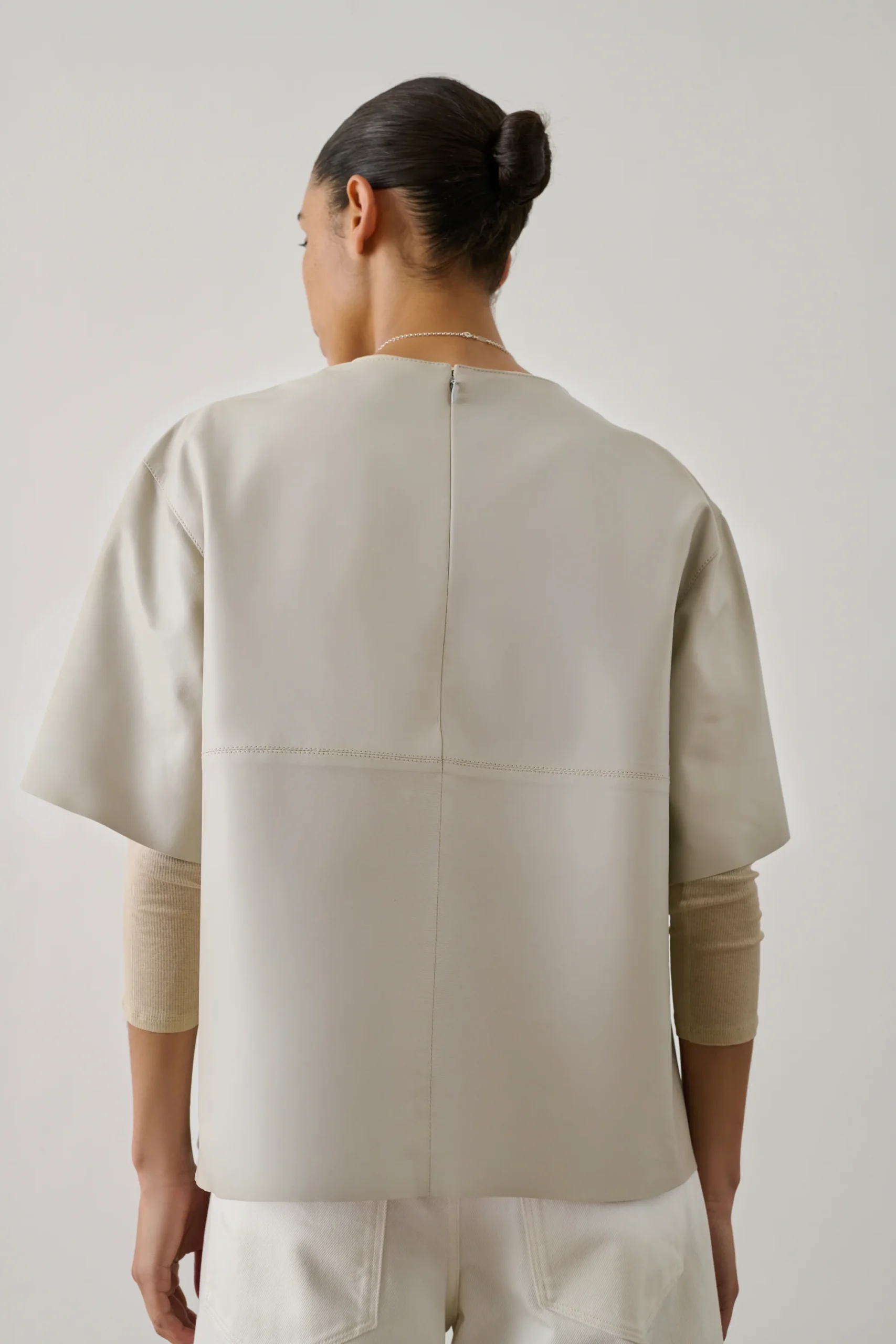 – Coupe ample – Manches courtes – Encolure ronde – Fermeture zip au dos et petit crochet – Détails de surpiqûres – Cuir LWG (Leather Working Group)