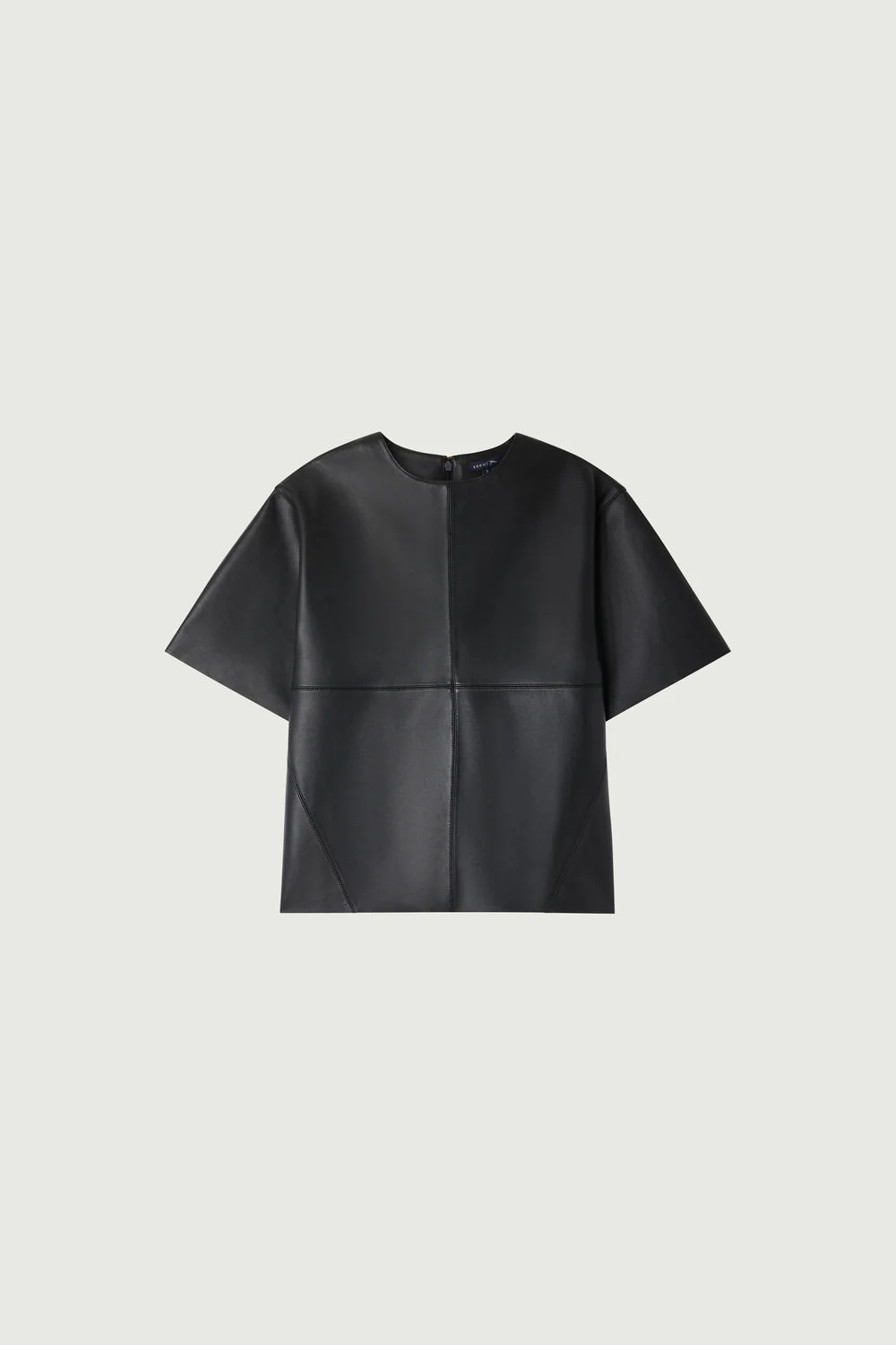 FRIEDA est une blouse en cuir souple, à la coupe ample et manches courtes. Son encolure ronde et sa fermeture zip au dos ajoutent une touche moderne. Parfaite pour être portée seule ou superposée, elle maintient les volumes avec élégance.