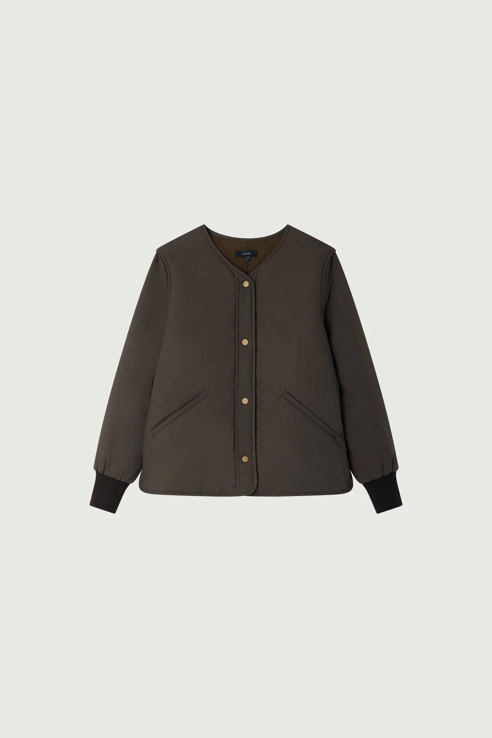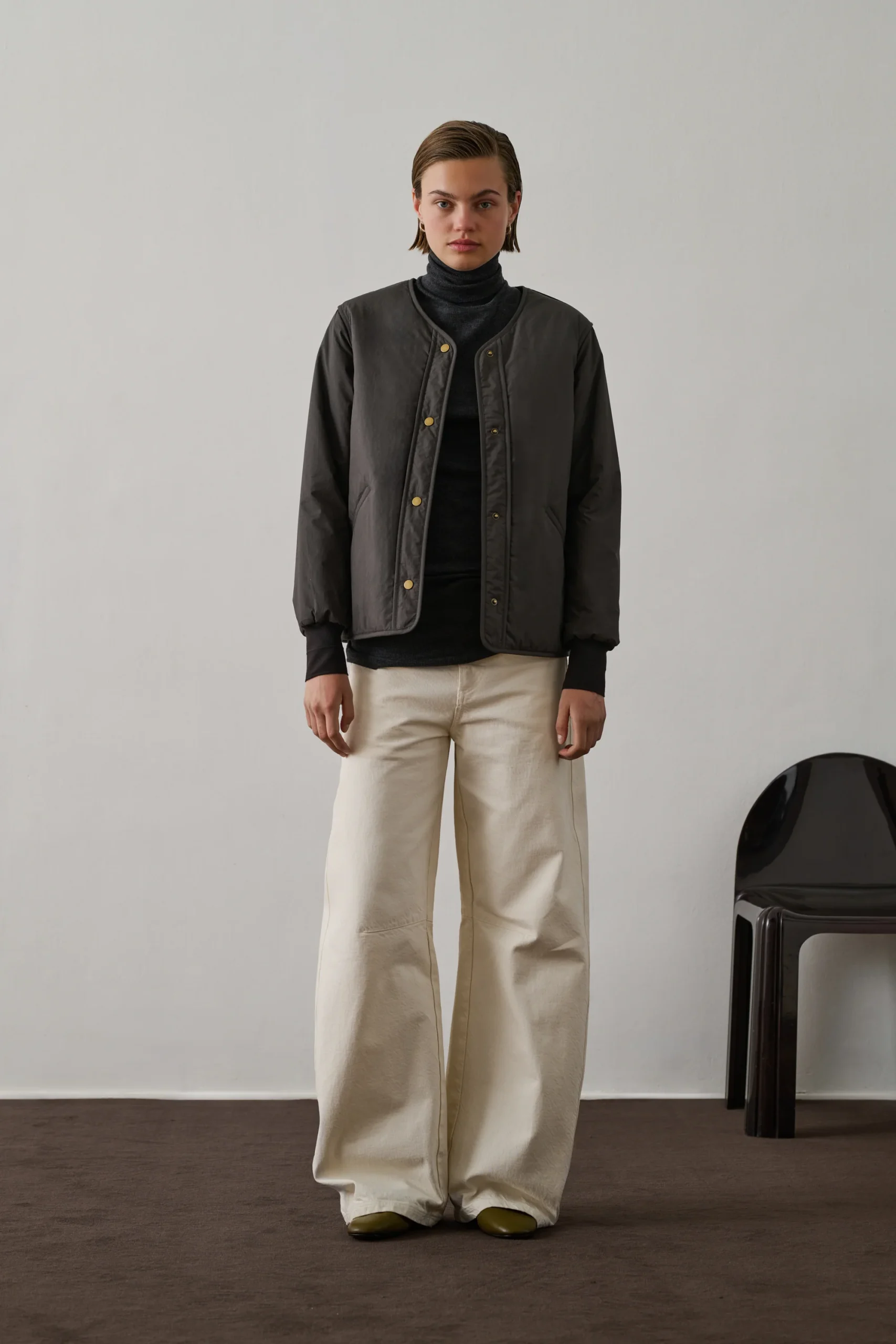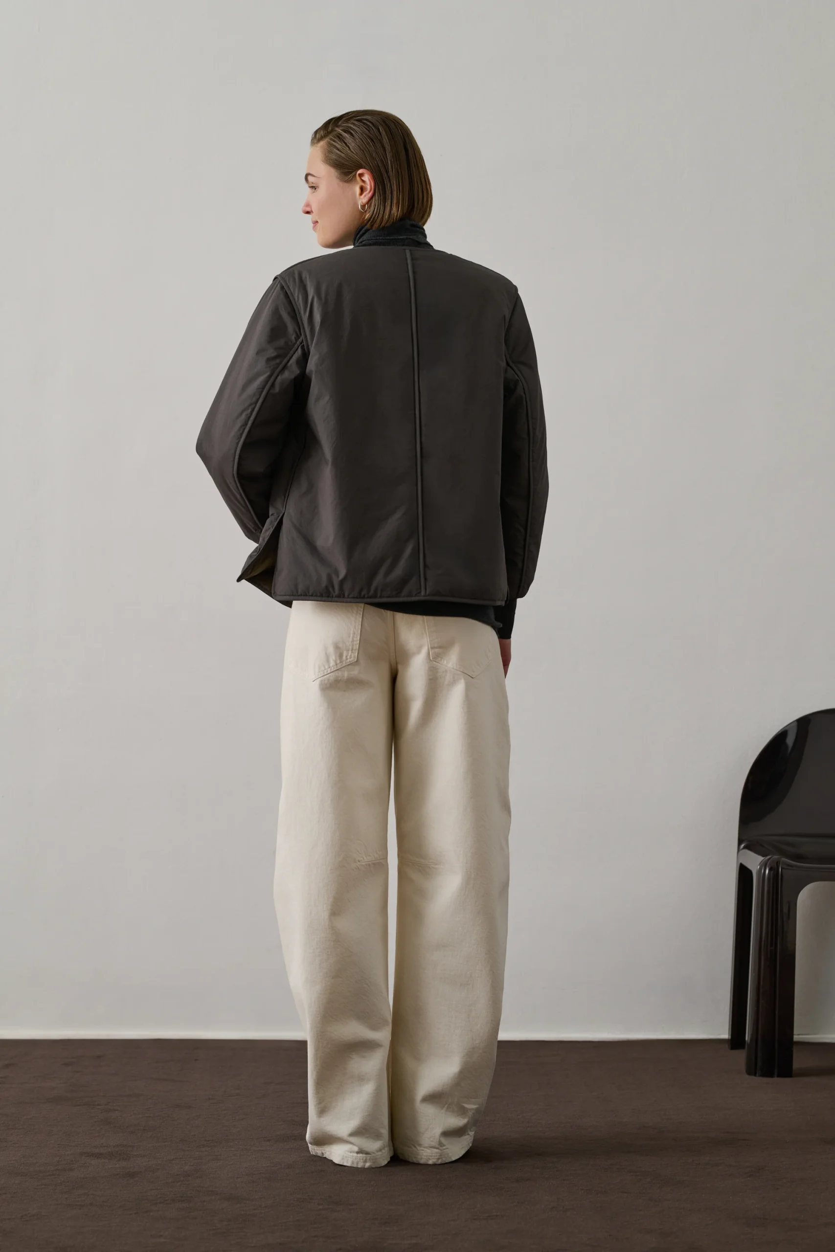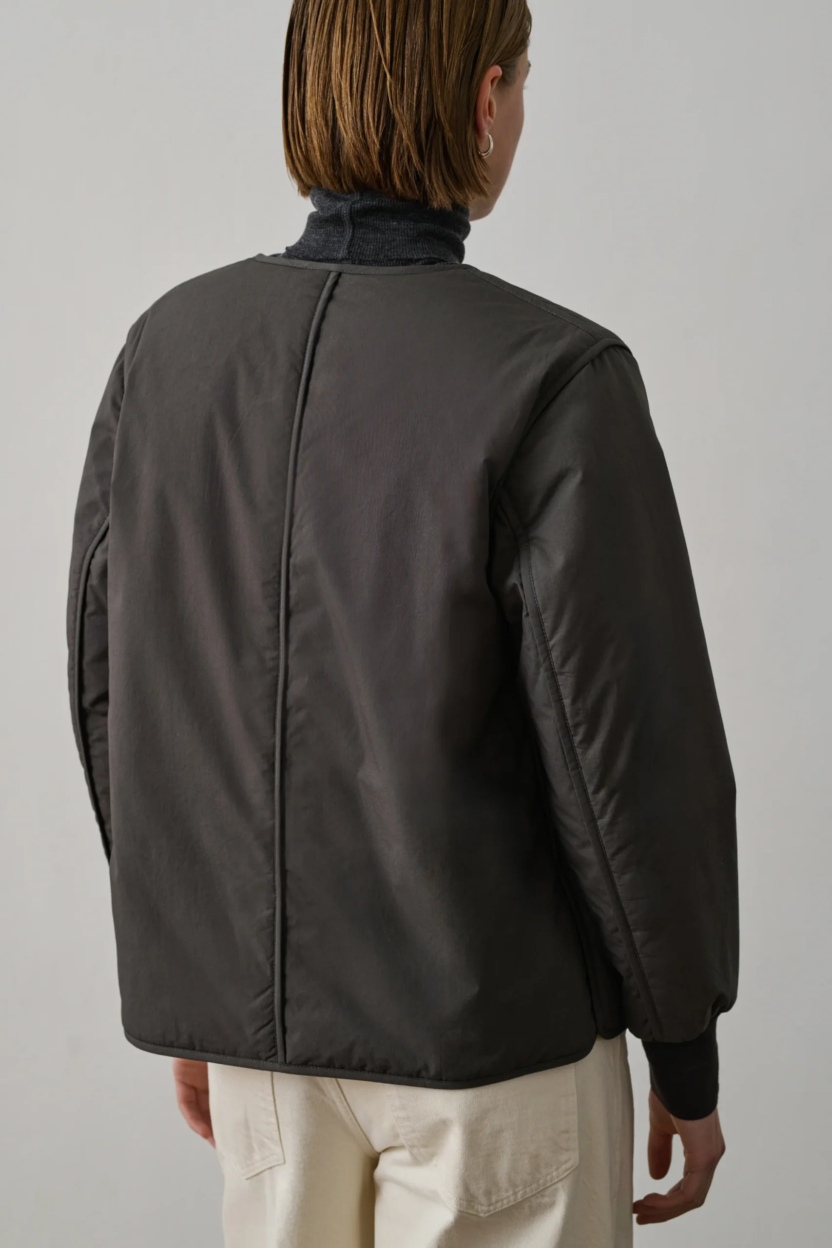 GOJI est un blouson ouatiné en coton émerisé gris foncé. Sa coupe droite et sa longueur aux hanches s’accompagnent d’une encolure en V et d’une ouverture à boutons pression. Deux poches passepoilées ajoutent du style. Léger et doux, il est parfait pour la mi-saison.