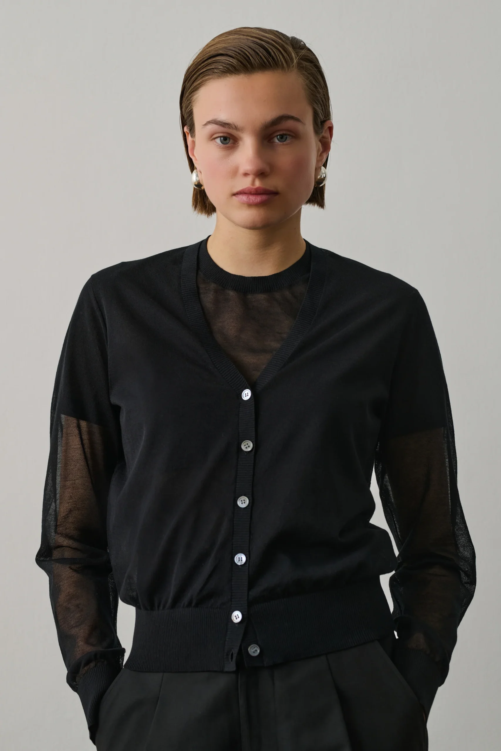 ETRETAT est un cardigan tricoté dans une maille ultra fine. Il se porte à même la peau ou en superposition pour jouer sur des effets de transparence. Versatile, il se veut habillé ou décontracté. – Coupe droite resserré en bas de corps– Manches longues– Encolure en V – Ouverture boutonnée devant– Coton, jauge fine