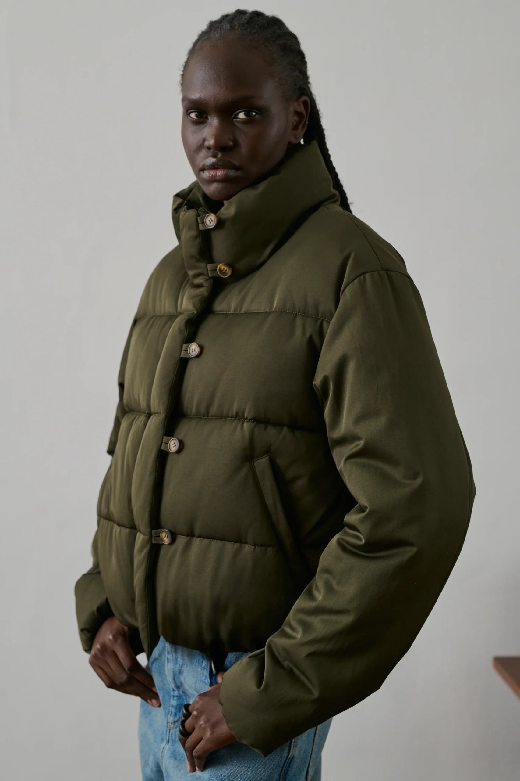 FLORE est une doudoune courte kaki à la coupe ample et boule. Son col montant et son ouverture boutonnée lui confèrent une allure moderne. Les poches passepoilées ajoutent une touche de style. Le bas élastiqué renforce l’effet arrondi. En coton déperlant, elle assure chaleur et protection en hiver.