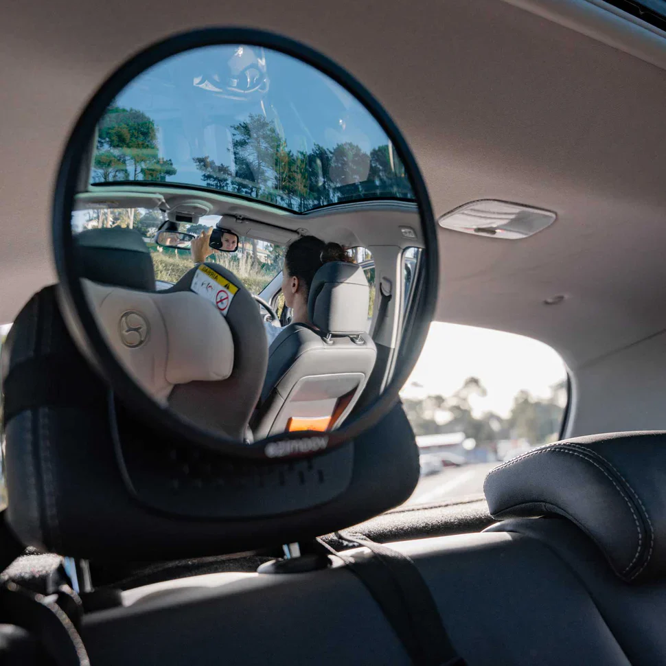 EZI MIRROR ROUND est un grand miroir rond légèrement incurvé à placer sur l’appui-tête de votre siège arrière, obtenez une vue complète de votre enfant sans avoir à vous retourner, il suffit de regarder depuis votre rétroviseur avant.