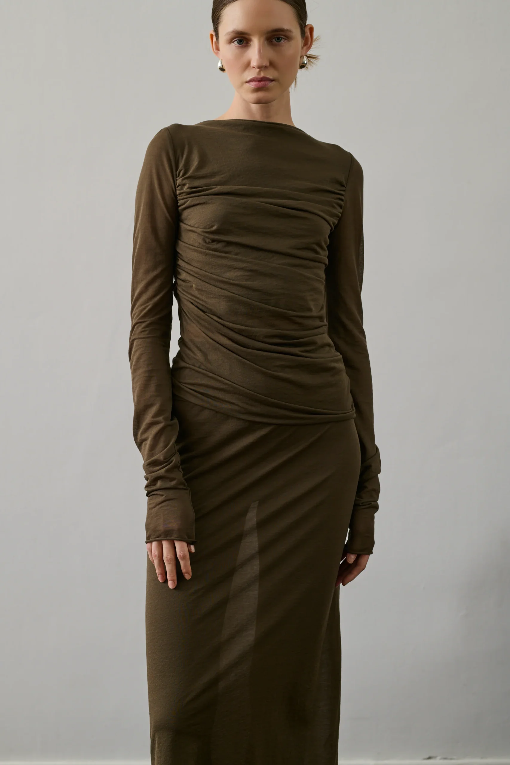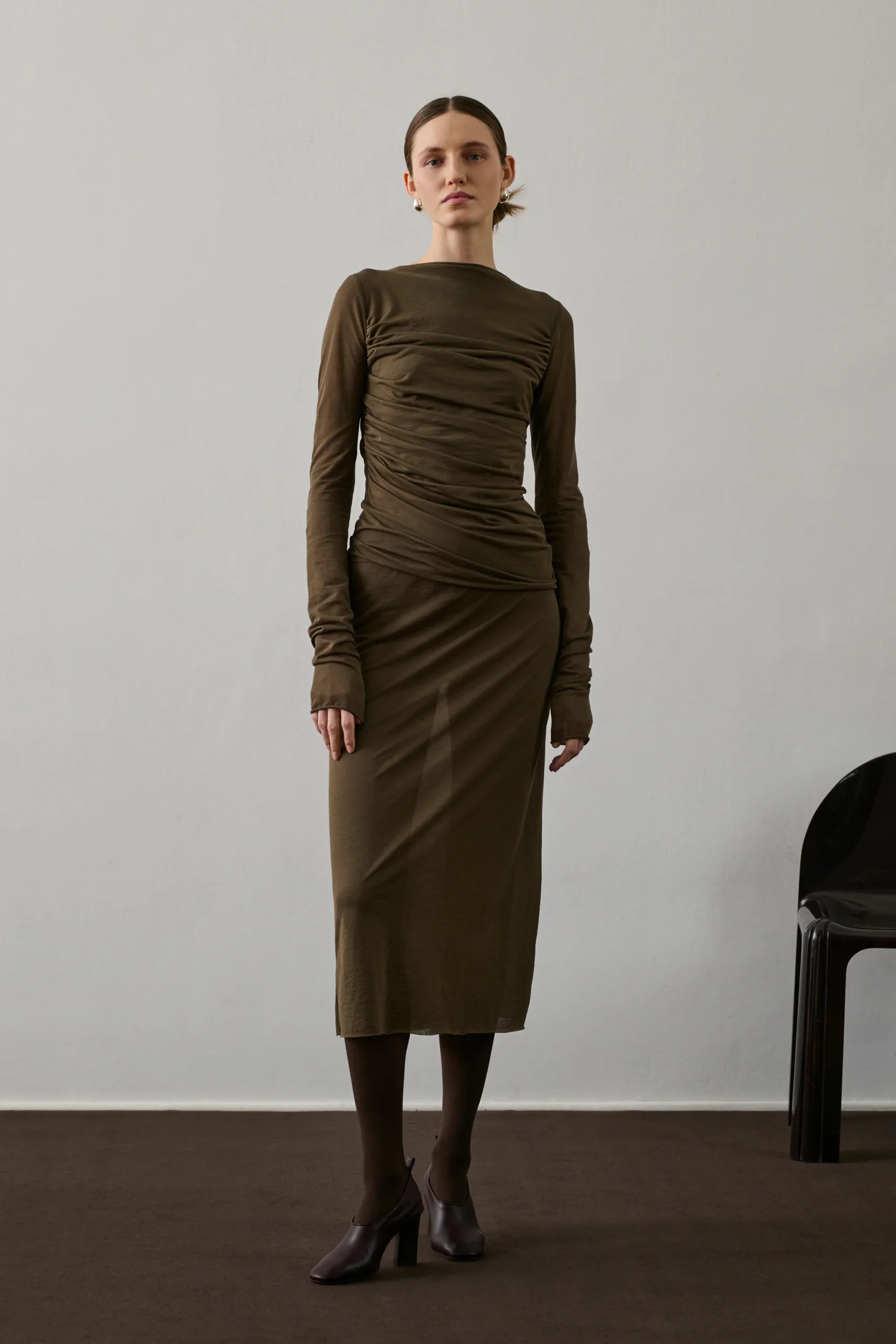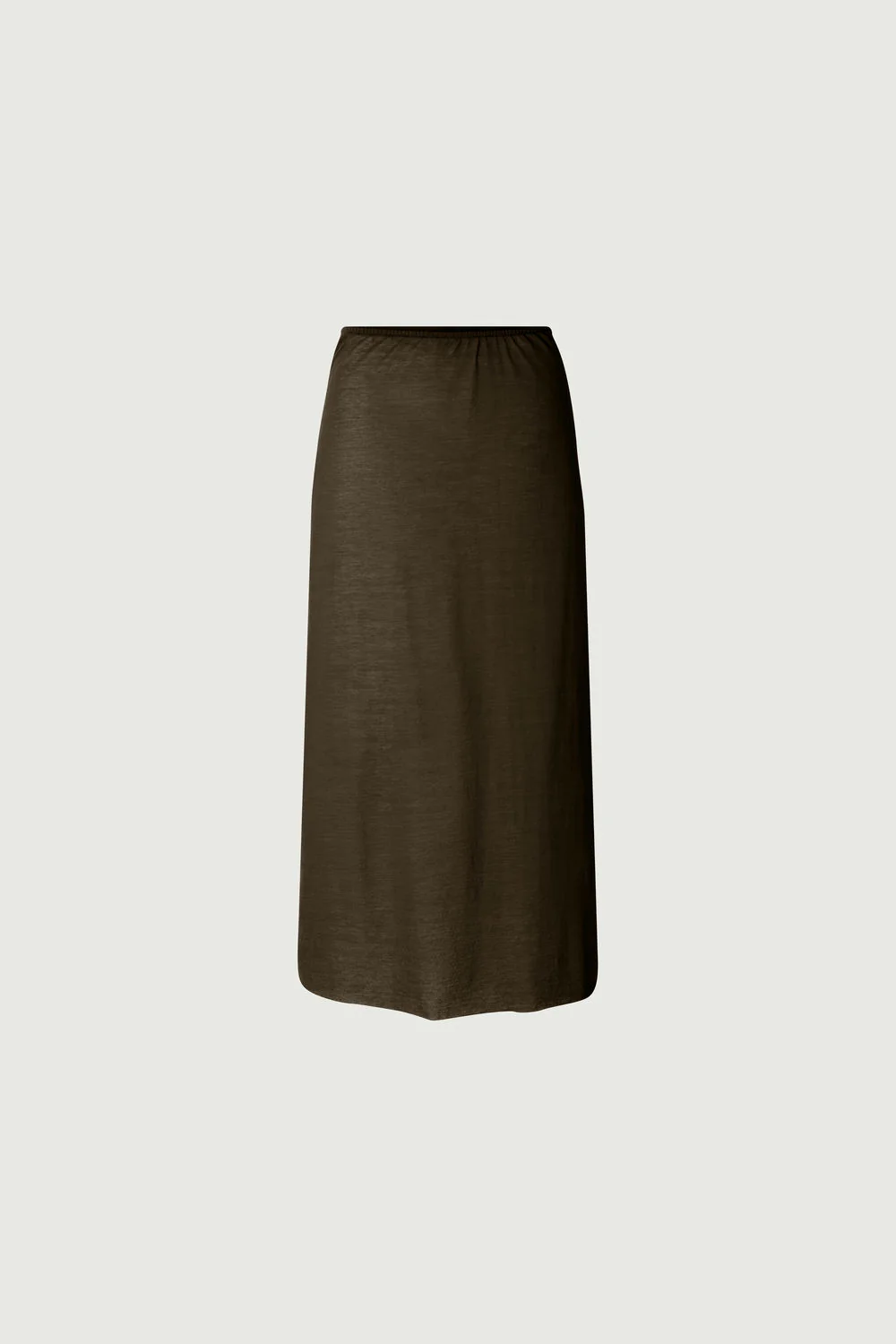 BAHIA est une jupe mi-longue en jersey fluide, à la coupe droite et légèrement évasée. Son jeu de transparence et sa taille élastiquée en font une pièce versatile.