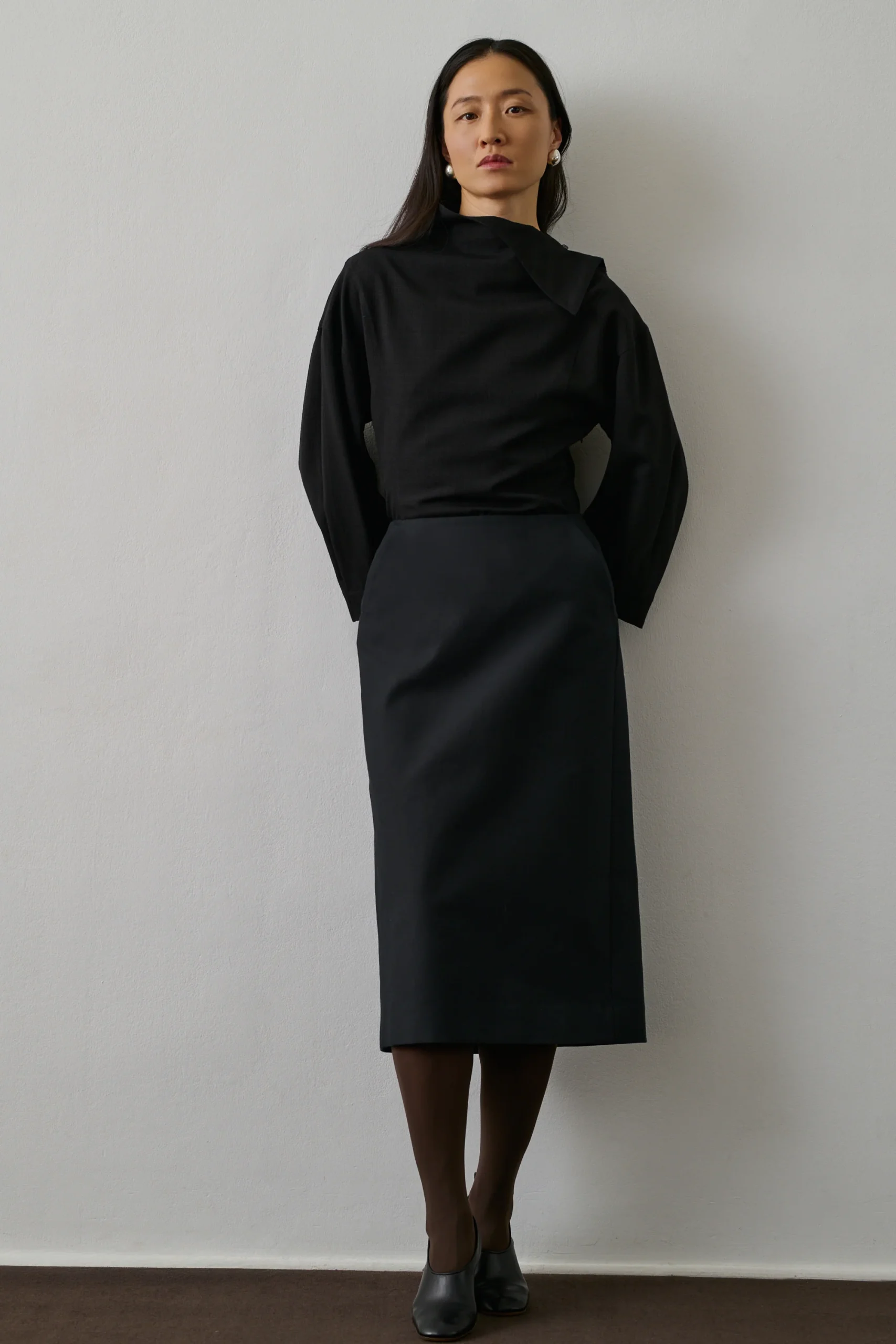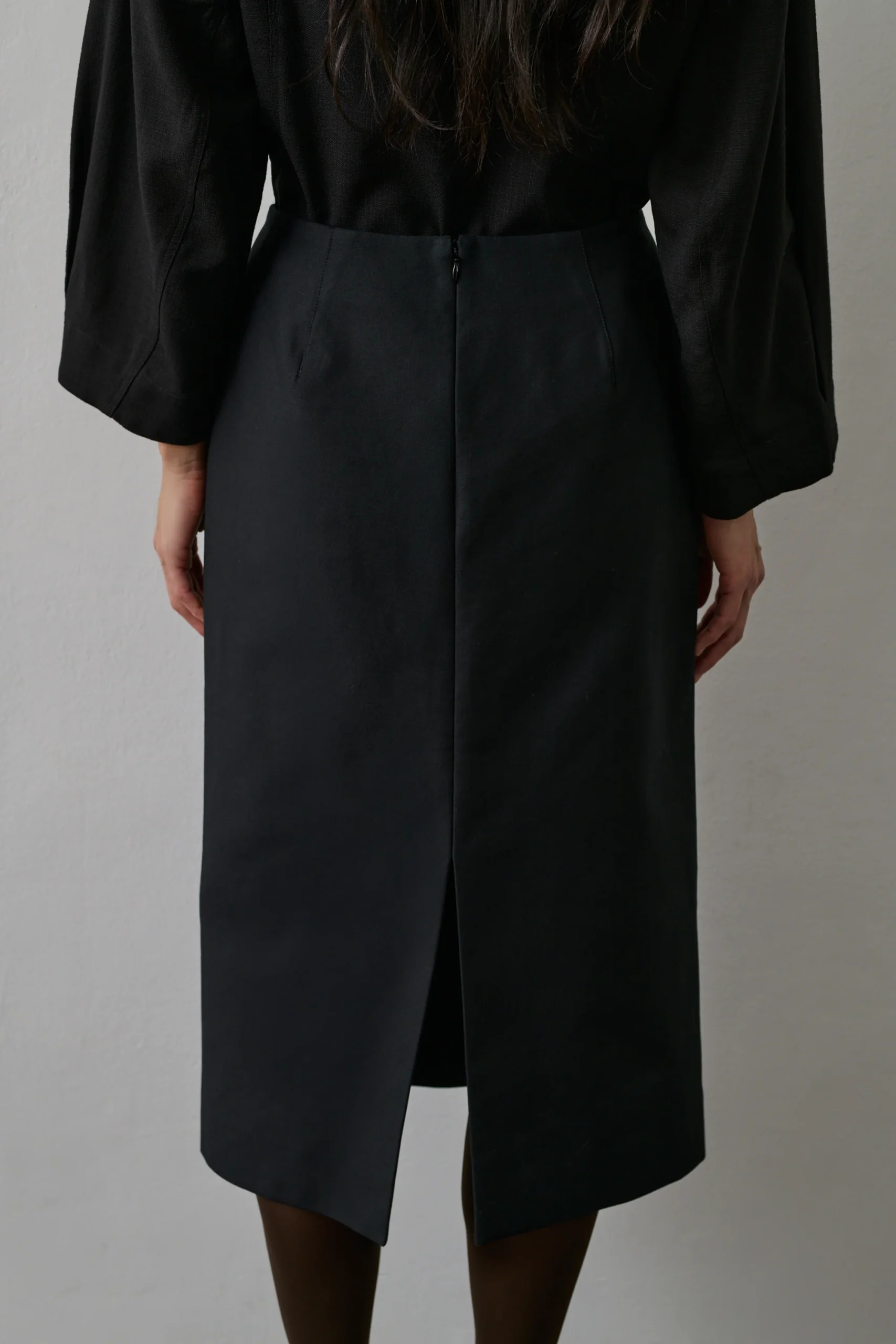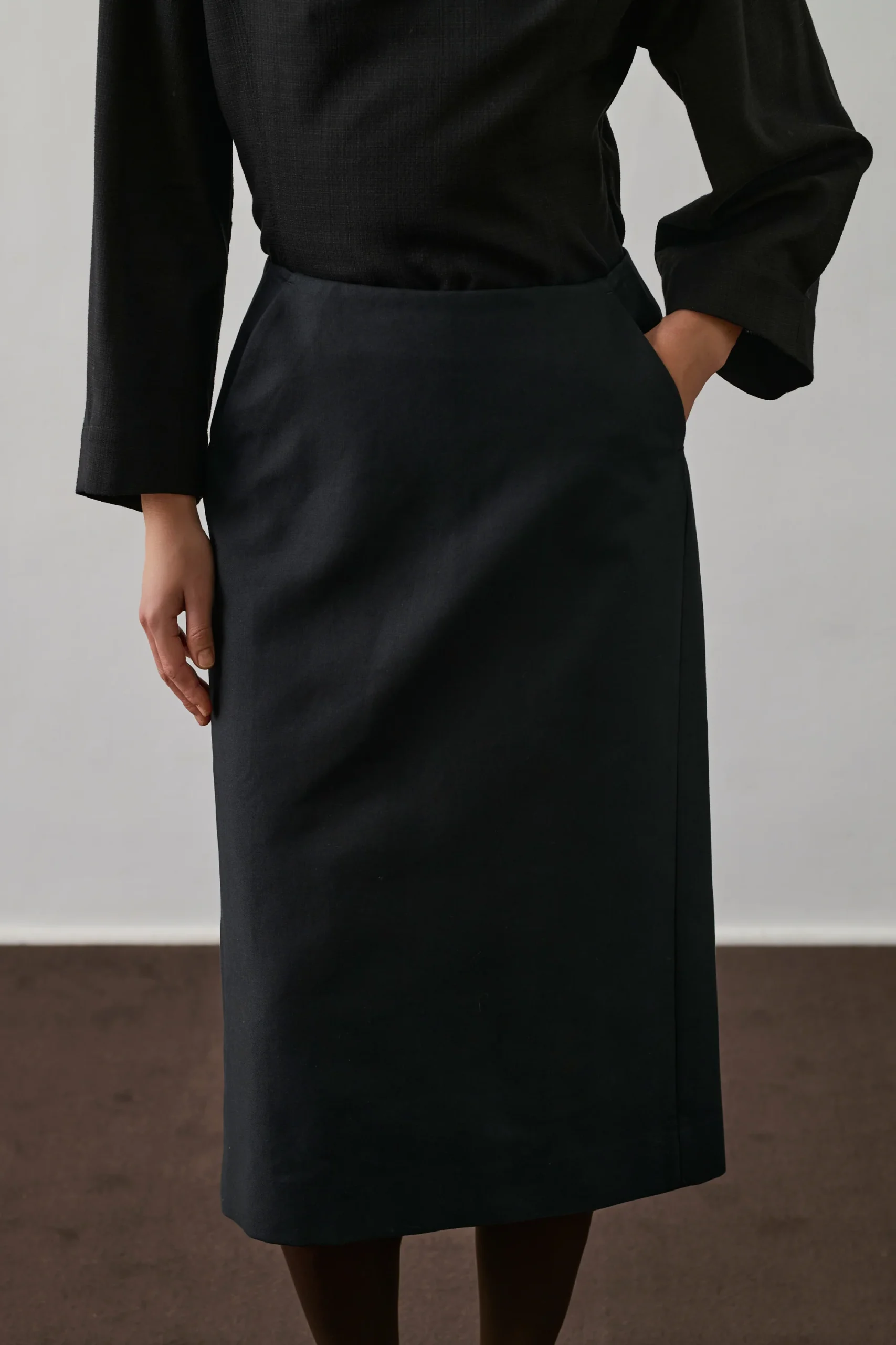 FLAVIA est une jupe crayon noire à la coupe cintrée et élégante. Sa longueur sous les genoux et sa fente au dos apportent une allure sophistiquée. Le satin de coton dense assure une tenue parfaite, complétée par un zip invisible et deux poches italiennes discrètes.