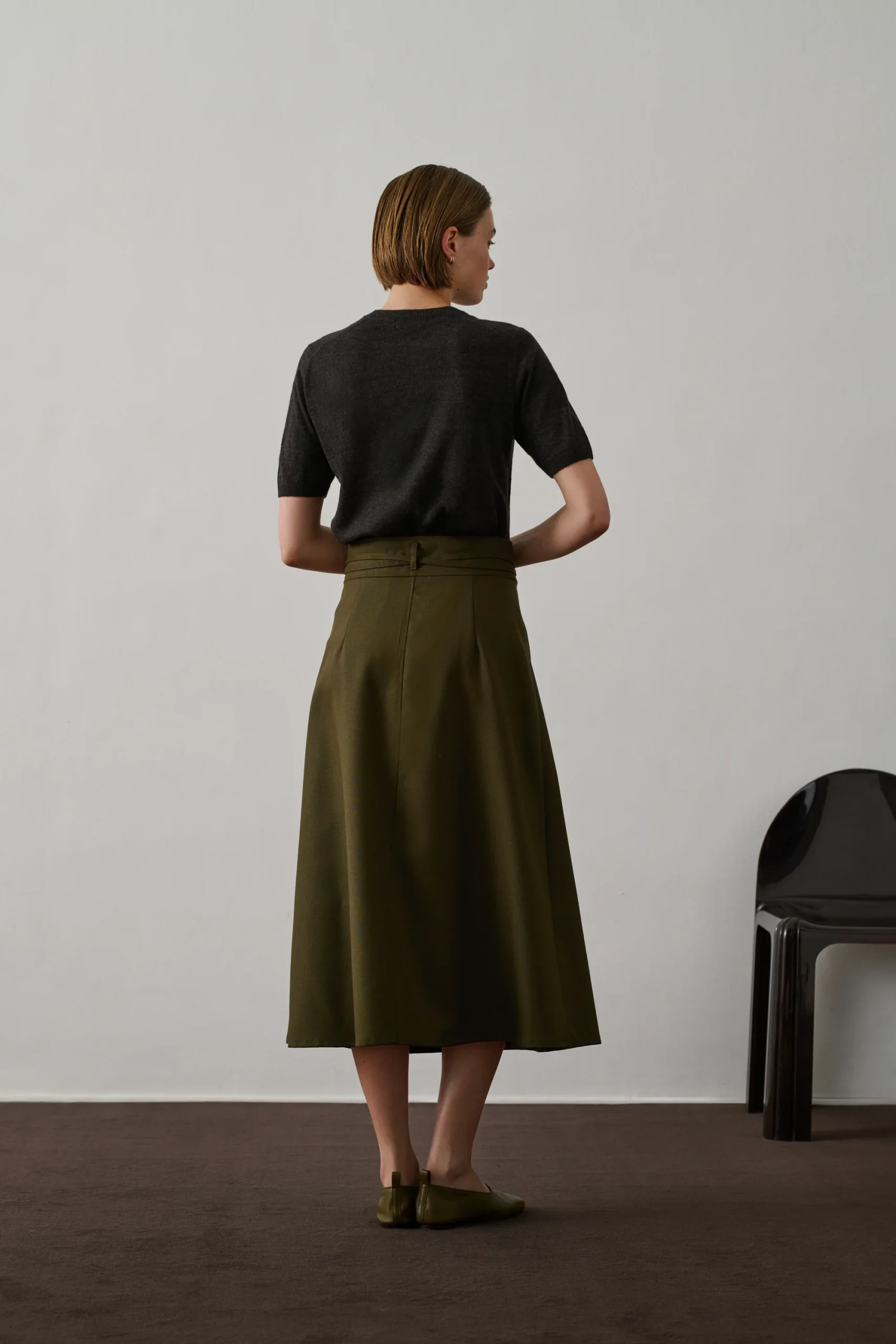 REINE est une jupe portefeuille en laine vierge kaki. Avec sa taille haute et son volume trapèze, elle atteint mi-mollet. La fermeture se fait par un lien noué et un bouton intérieur. Sa laine vierge assure chaleur et douceur, parfaite pour l’hiver.