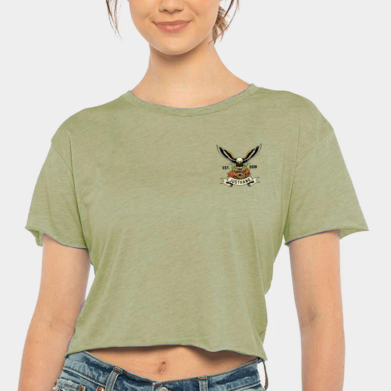Le Crop-Top pour femme JUSTHANG Eagle Snake, présenté ici en coloris vert d’eau, est un modèle à manches courtes, conçu pour vos sessions de fitness et de training.