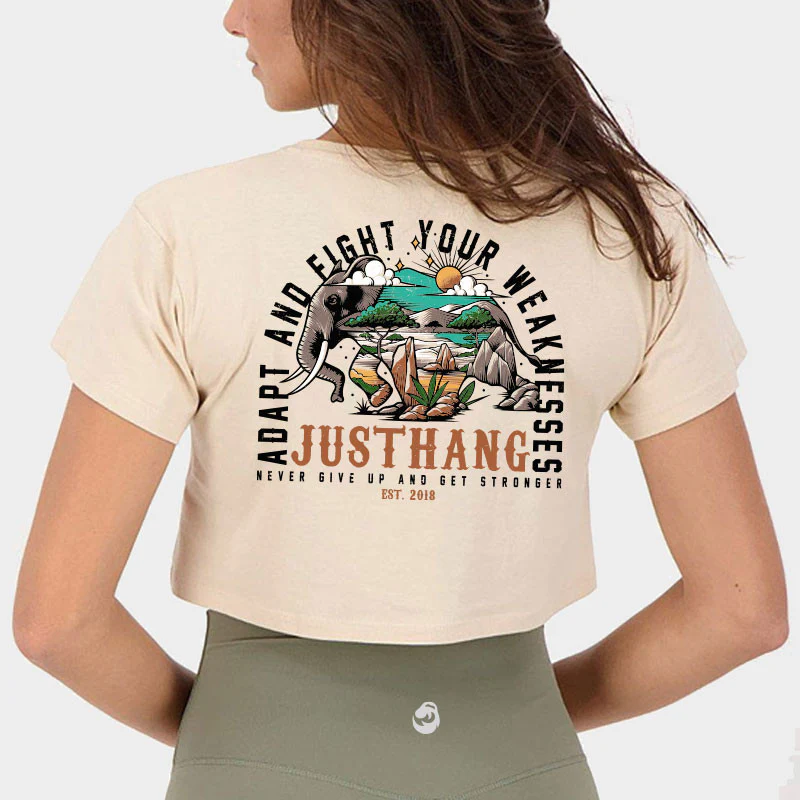 Le Crop-Top pour femme JUSTHANG Jumbo, présenté ici en coloris nude, est un modèle à manches courtes, conçu pour vos sessions de fitness et de training.