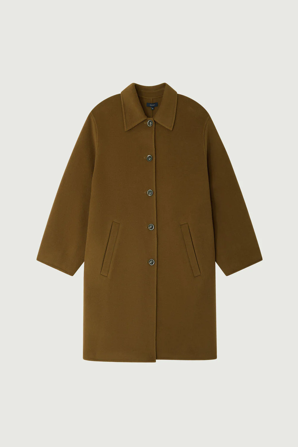 FAUBOURG est un manteau droit en laine double face caramel, longueur au-dessus du genou. Son ouverture boutonnée et ses poches passepoilées ajoutent une touche élégante. Les manches longues et rondes complètent ce modèle minimaliste, chaud et doux, inspiré du dufflecoat.