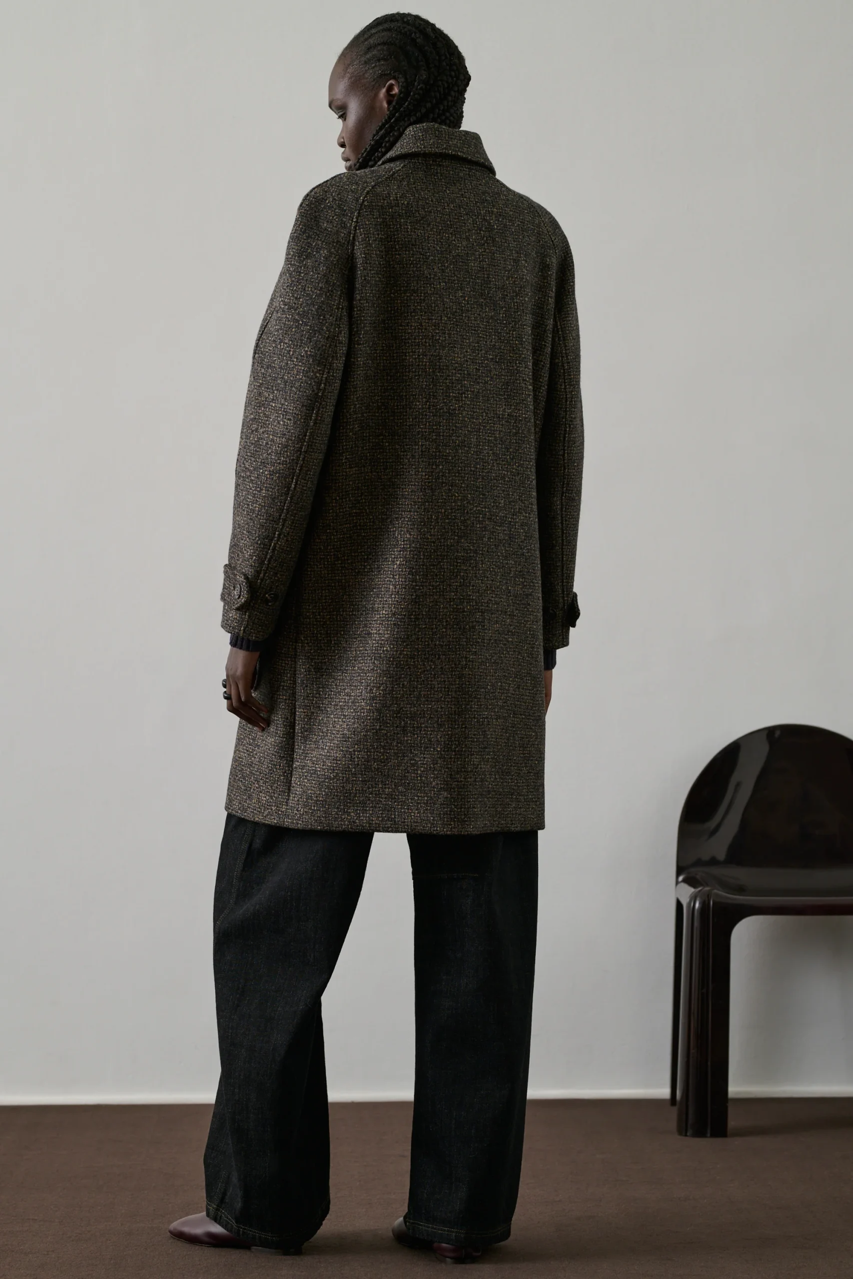 SIMBA est un manteau en drap de laine vierge au tombé impeccable. Sa coupe droite et ses manches raglan longues apportent une élégance intemporelle. La patte de boutonnage cachée et les quatre poches à rabat ajoutent une touche de sophistication. Le drap de laine moucheté assure chaleur et confort.