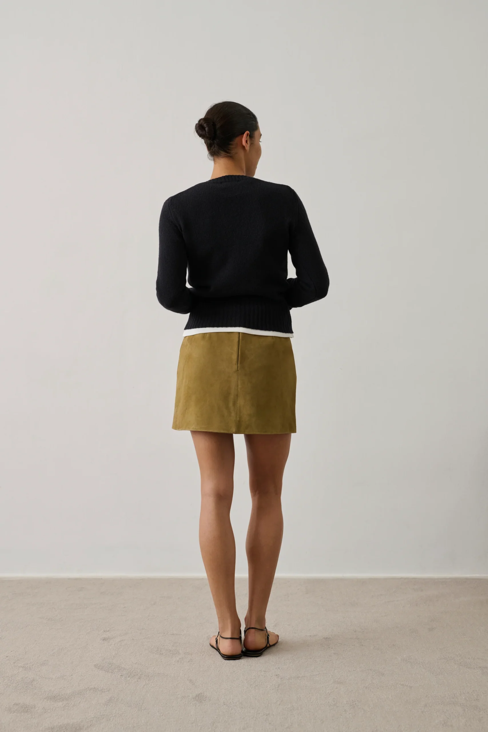 – Coupe droite – Longueur mi-cuisses – Zip au dos et crochet invisible – Détails de surpiqûres au dos