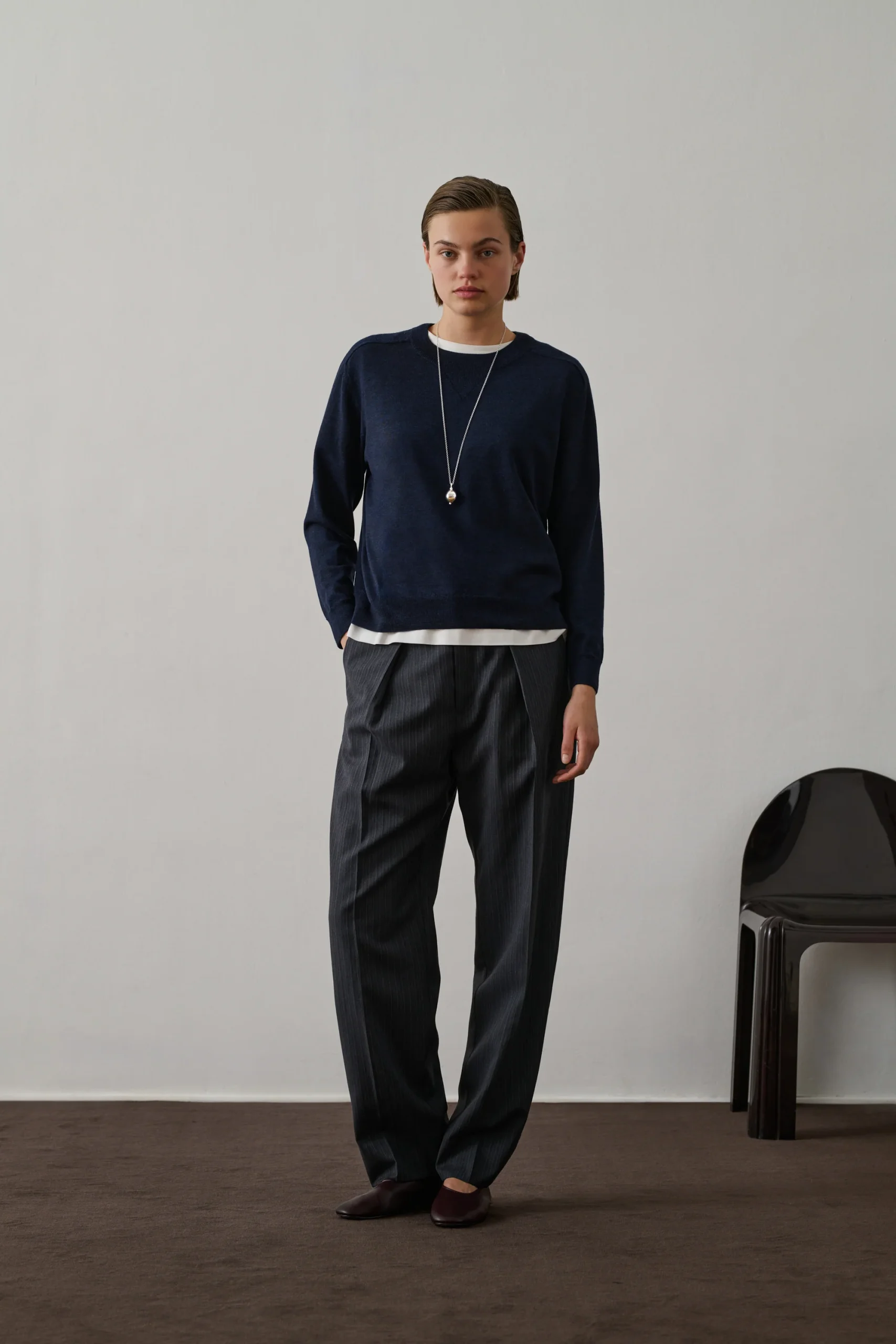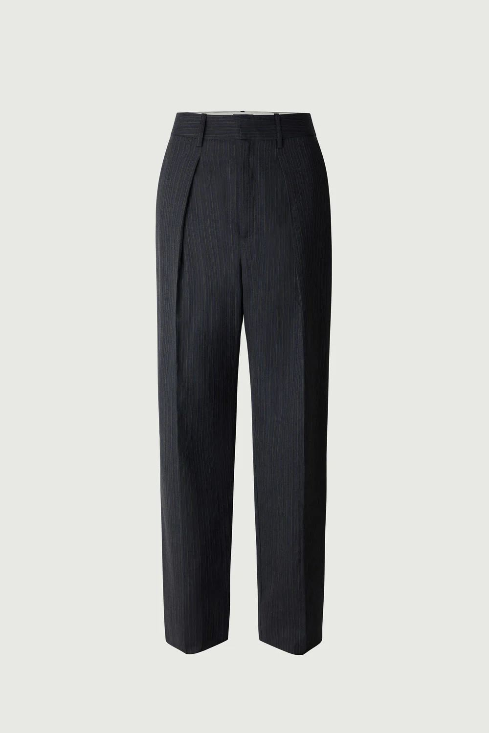 FERREL est un pantalon de tailleur en laine et coton finement rayé, à la coupe ajustée et longueur cheville. Sa taille mi-haute s’ouvre par crochet et bouton intérieur, avec fermeture zippée sous patte. Deux poches italiennes à l’avant et deux passepoilées au dos complètent ce modèle élégant.