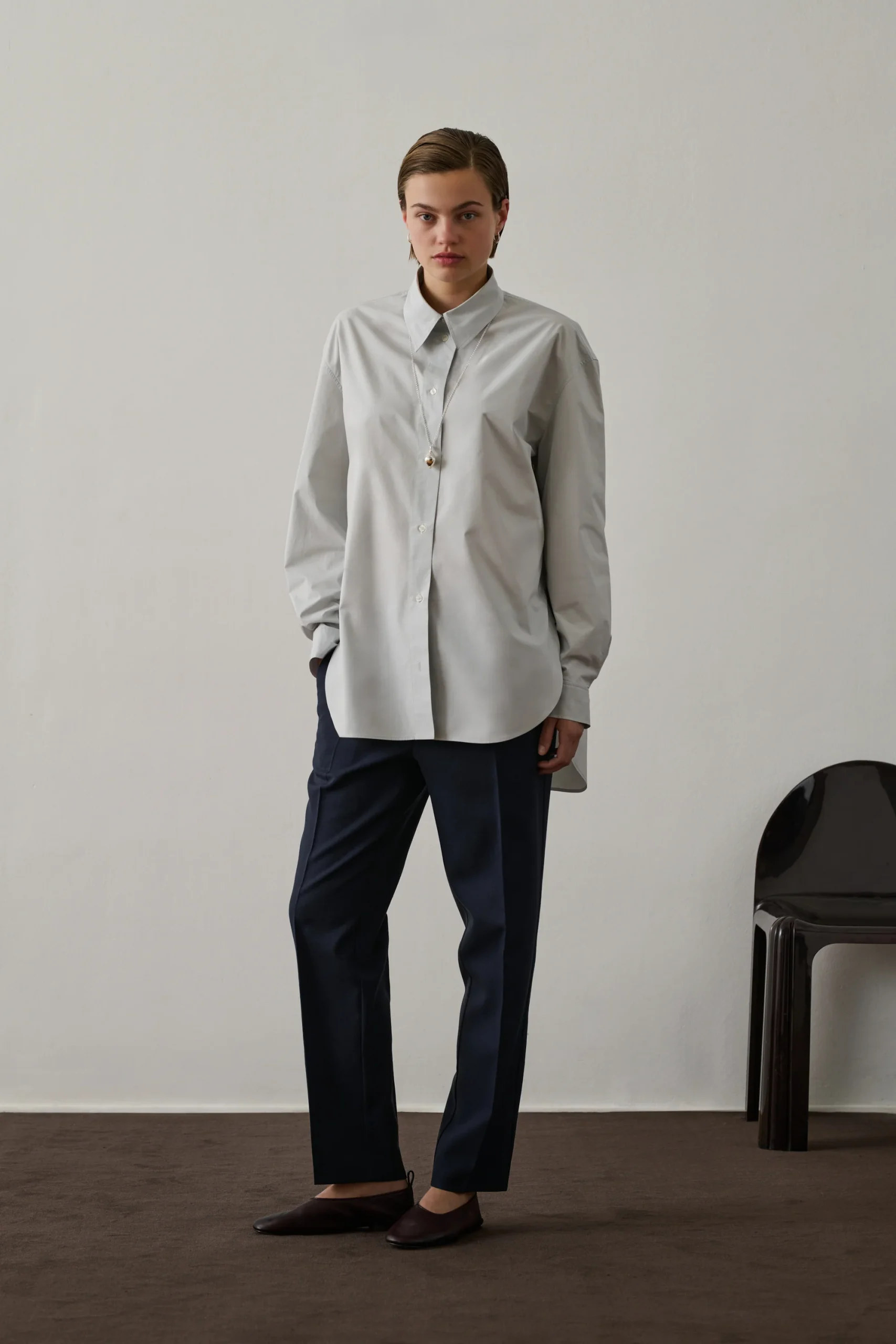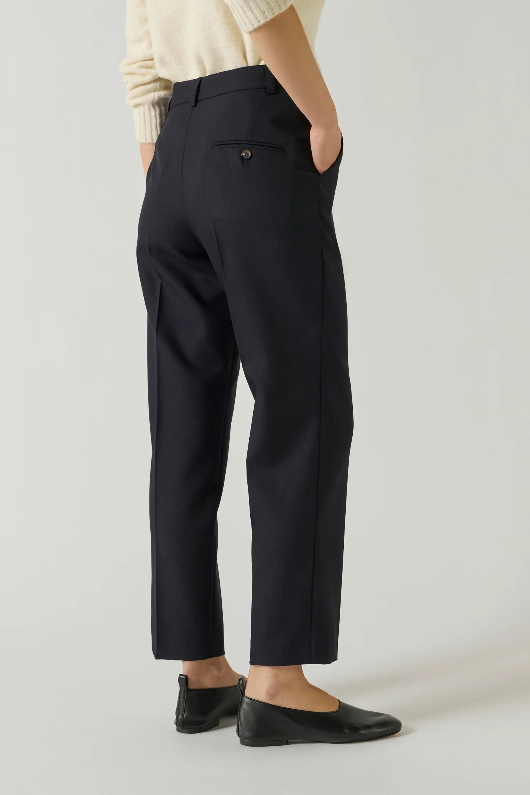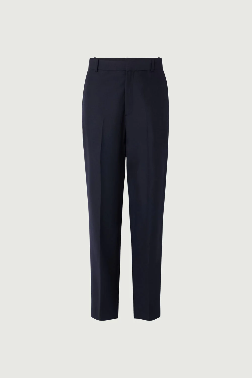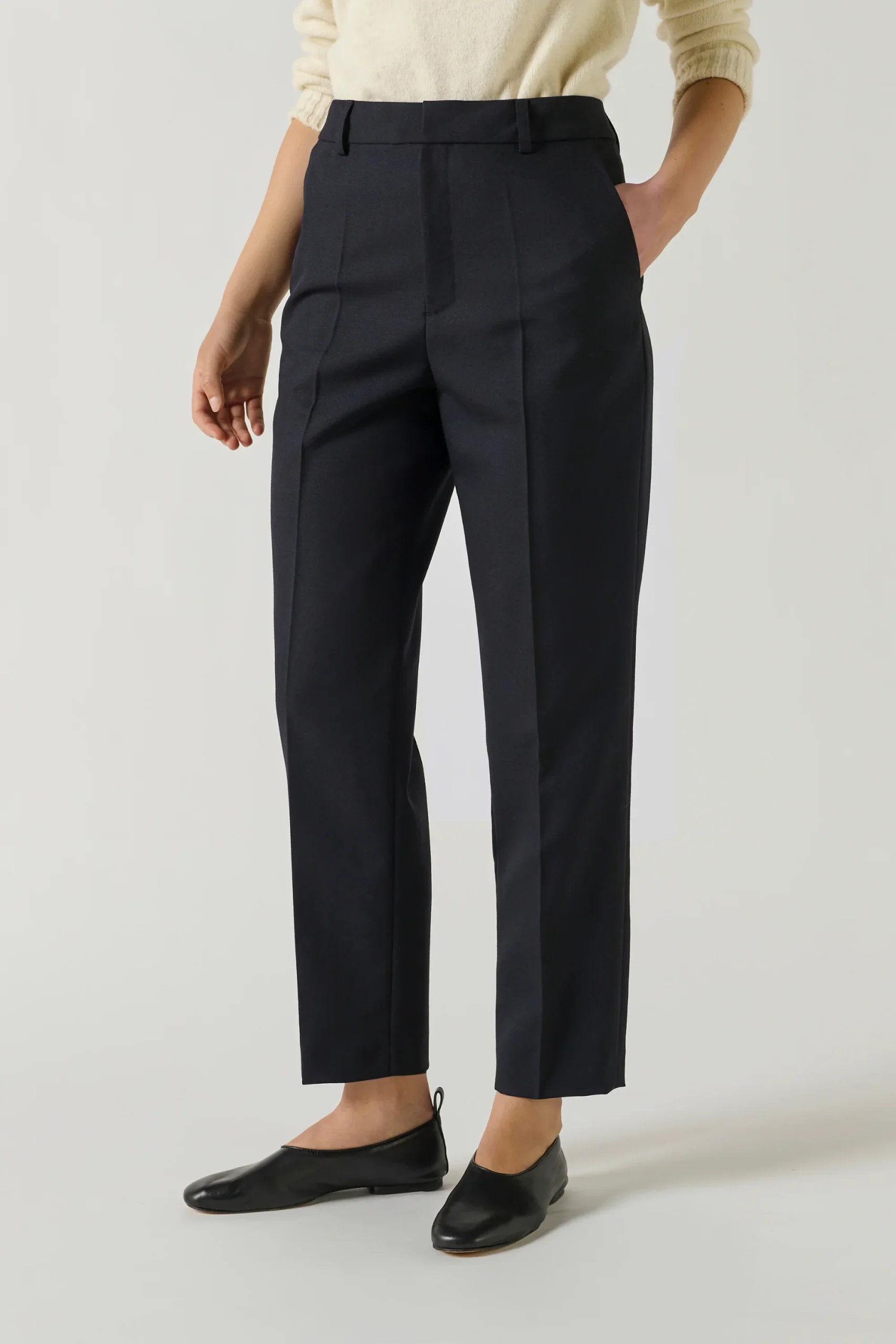 GABRIEL est un pantalon de tailleur en toile de laine vierge. Sa coupe cigarette ajustée et sa longueur cheville assurent une silhouette élancée. Taille mi-haute avec fermeture à crochet et zip, il dispose de poches italiennes devant et d’une poche passepoilée au dos.