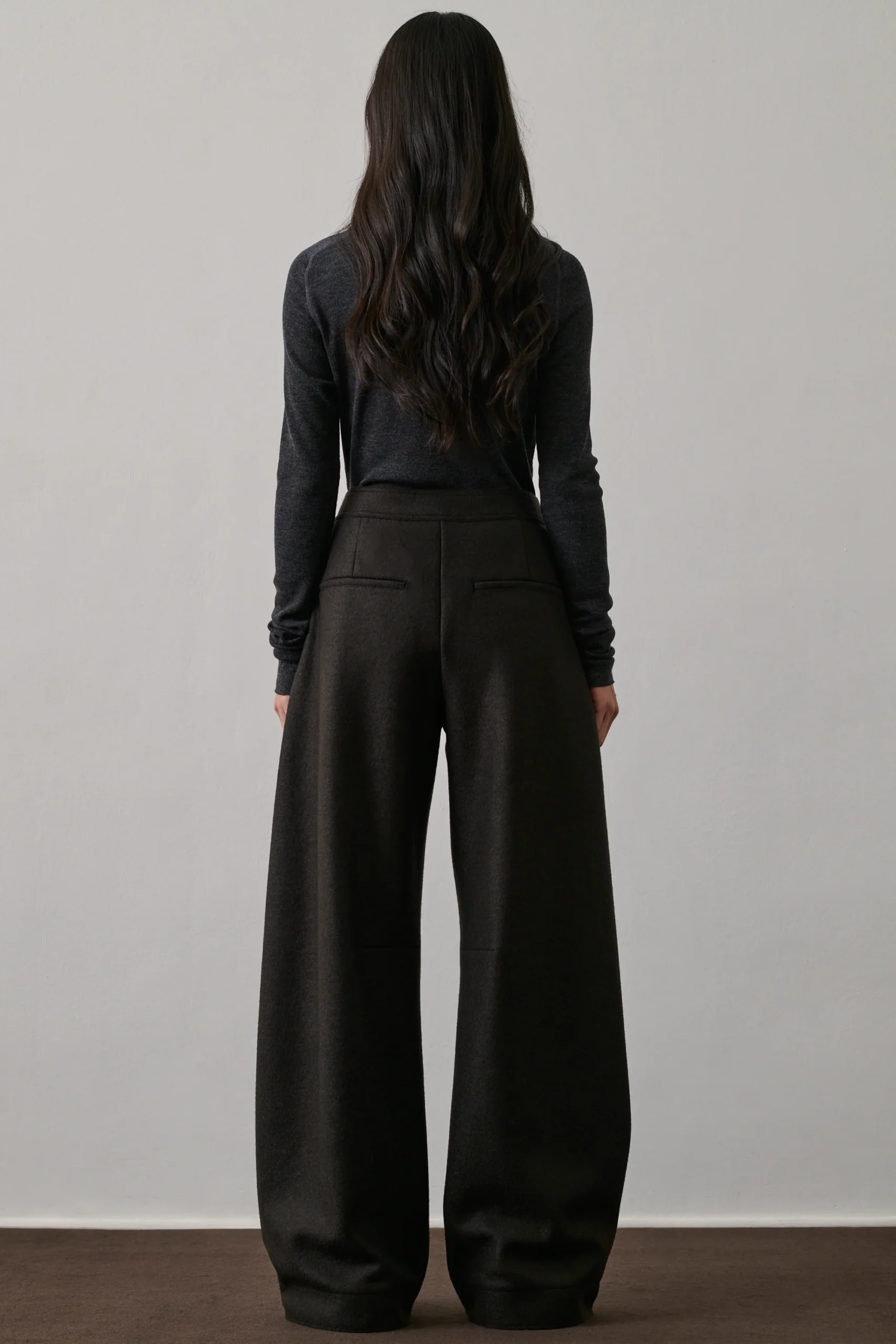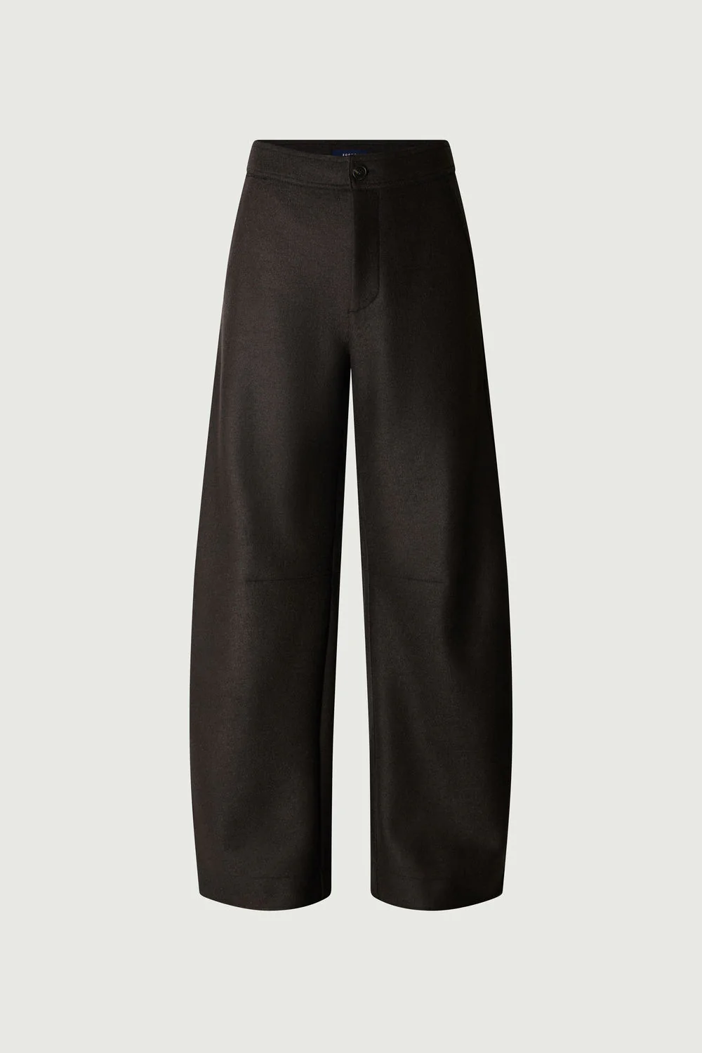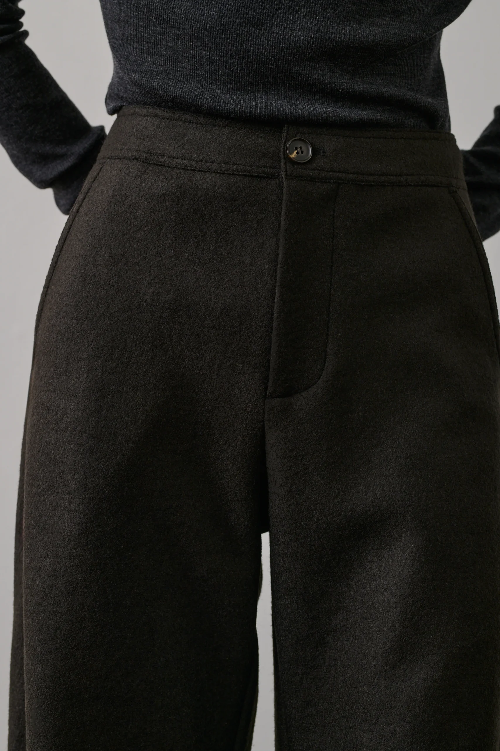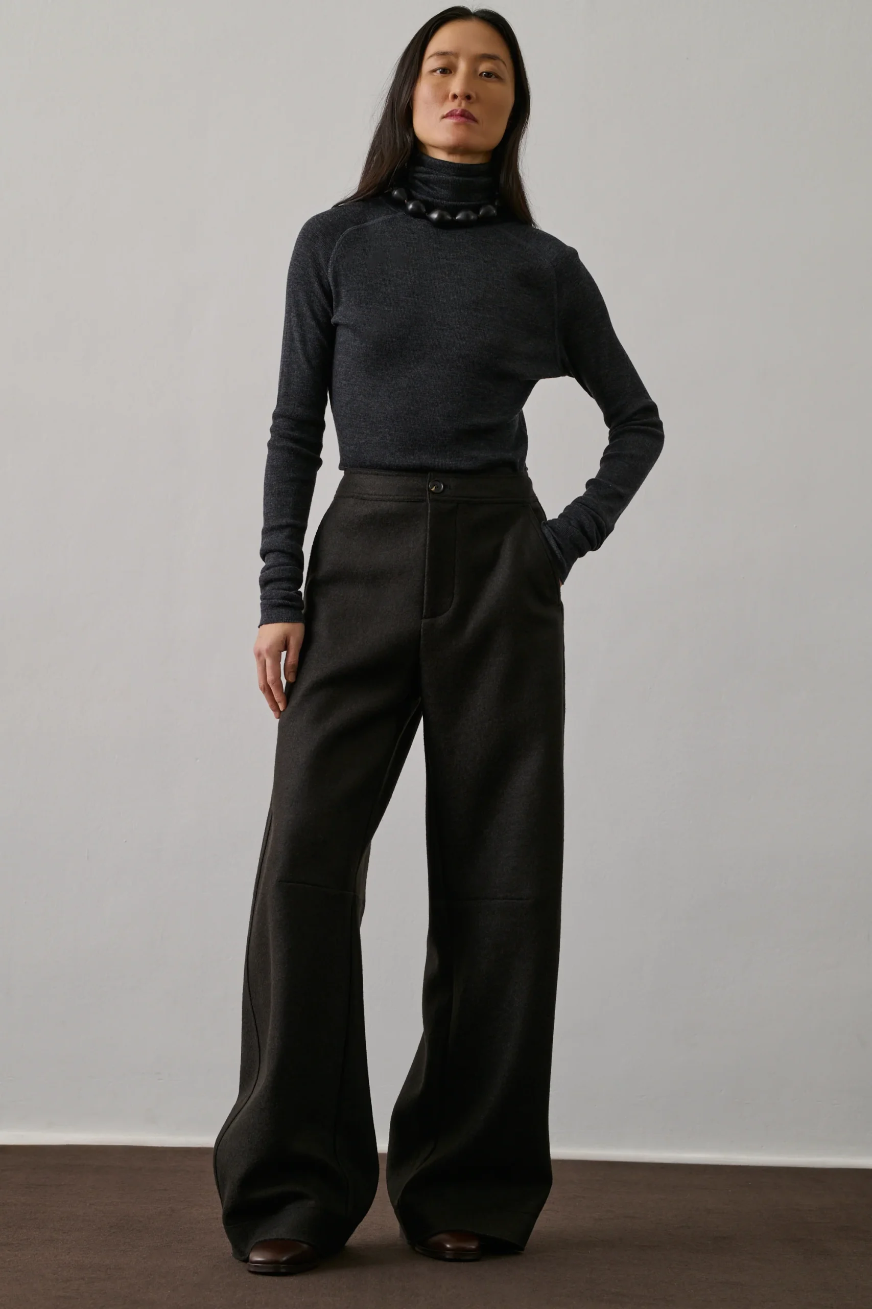 GIBSON est un pantalon en laine bouillie vert ébène, à la coupe ample et arrondie. Ses poches italiennes et passepoilées, ainsi que ses pinces aux genoux, soulignent son style. La laine dense et souple assure une silhouette élégante.