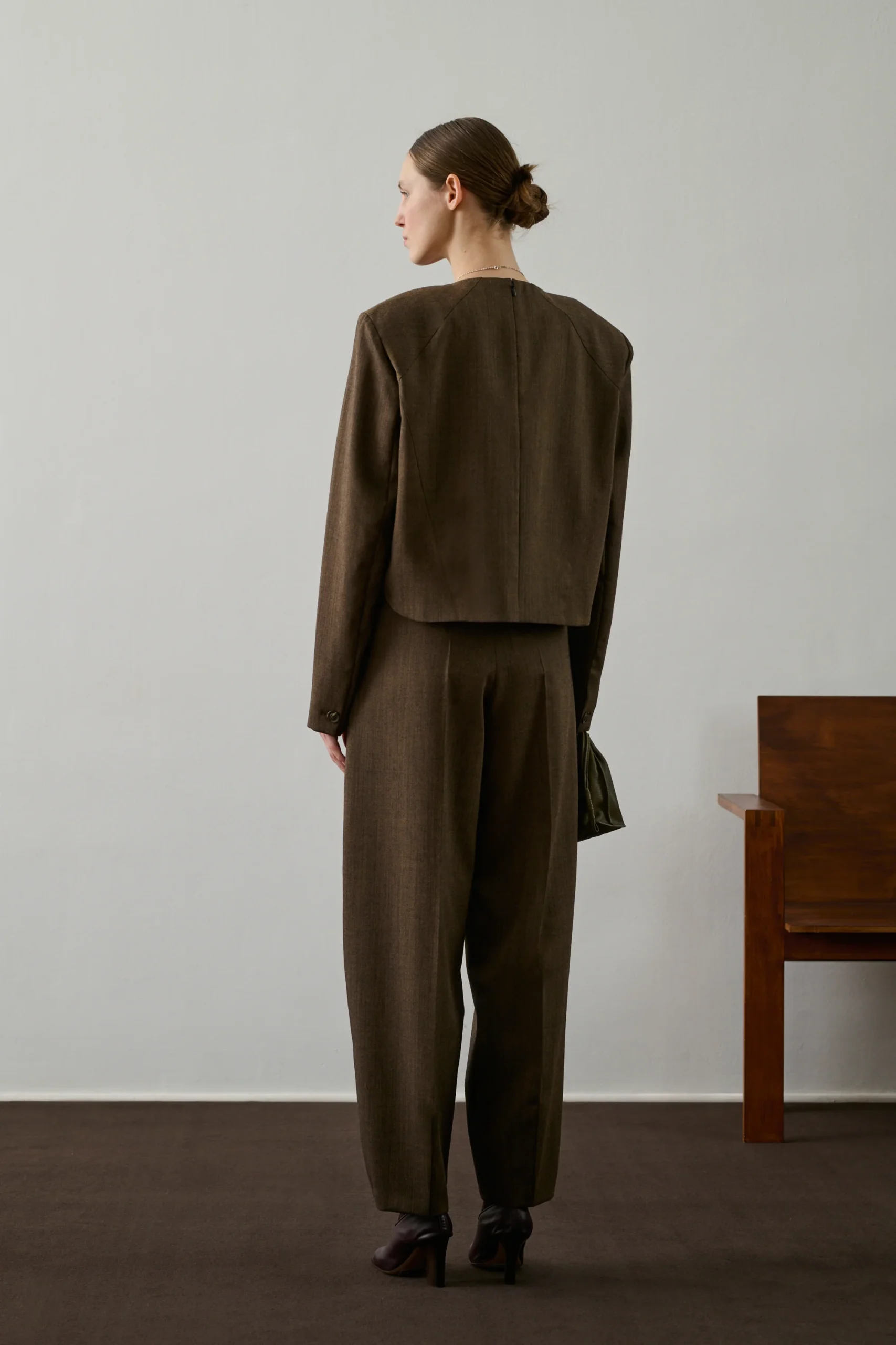 GRAHAM est un pantalon de tailleur en toile de laine vierge, coupe ajustée, longueur cheville. Taille mi-haute, fermeture par crochet et bouton, poches italiennes. Pli marqué, tissu souple, tombé impeccable. – Coupe ajustée– Longueur cheville– Taille mi-haute avec ouverture par crochet et bouton intérieur– Fermeture zippée sous patte– Deux poches italiennes devant, une poche passepoilée […]