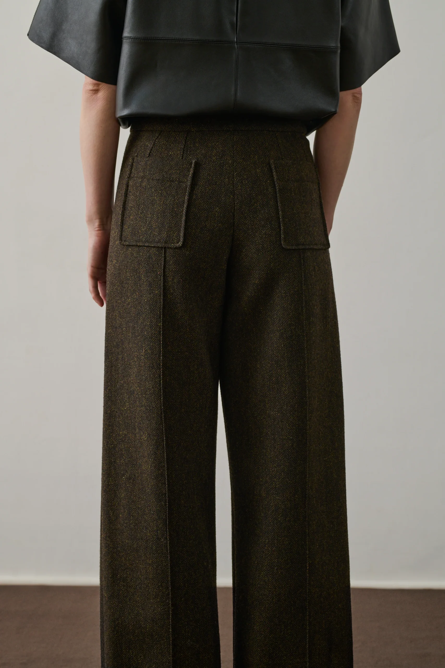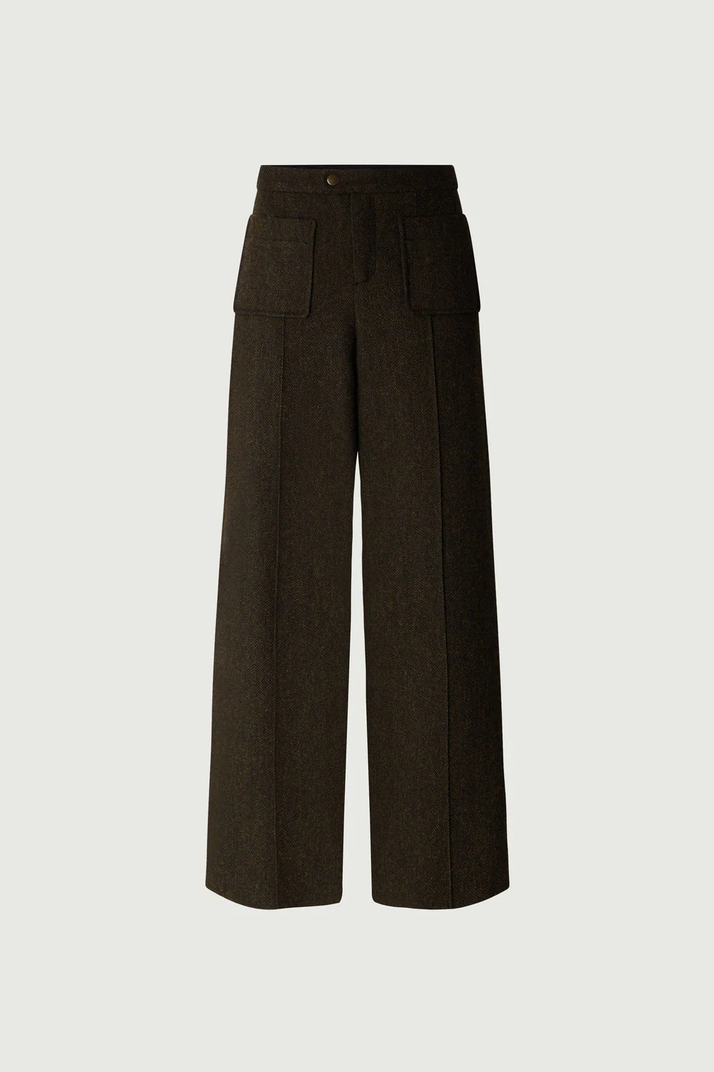 HARRY est un pantalon iconique du vestiaire Soeur, identifiable par ses poches plaquées à l’avant et à l’arrière et son pli marqué le long de la jambe.Il convient à toutes les morphologies grâce à sa coupe légèrement évasée et sa longueur 7/8e suspendue sur la cheville qui allonge la silhouette. Cette version en laine apporte au modèle une pointe de fantaisie de part son motif chevron aux coloris fondus kaki et marron.
