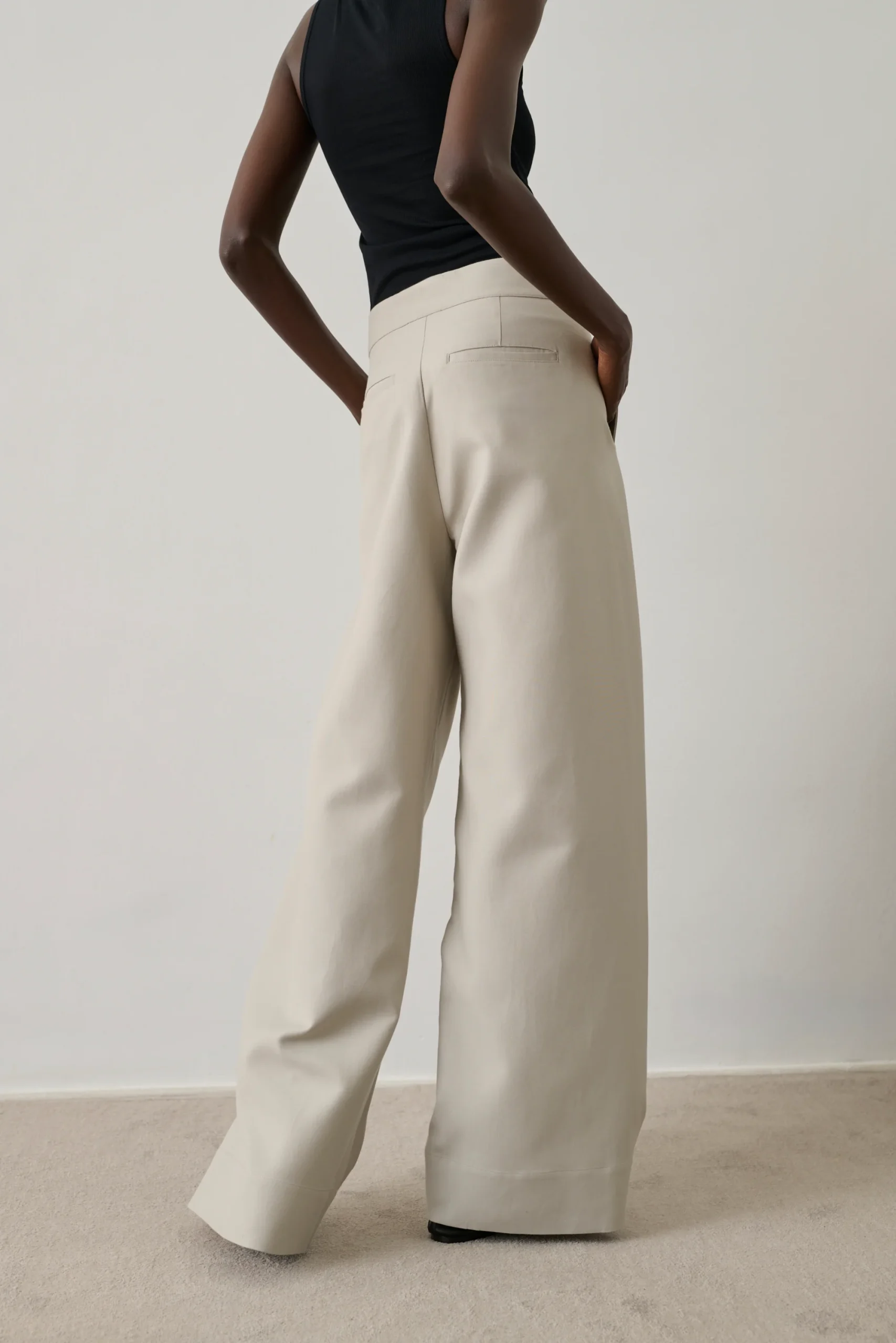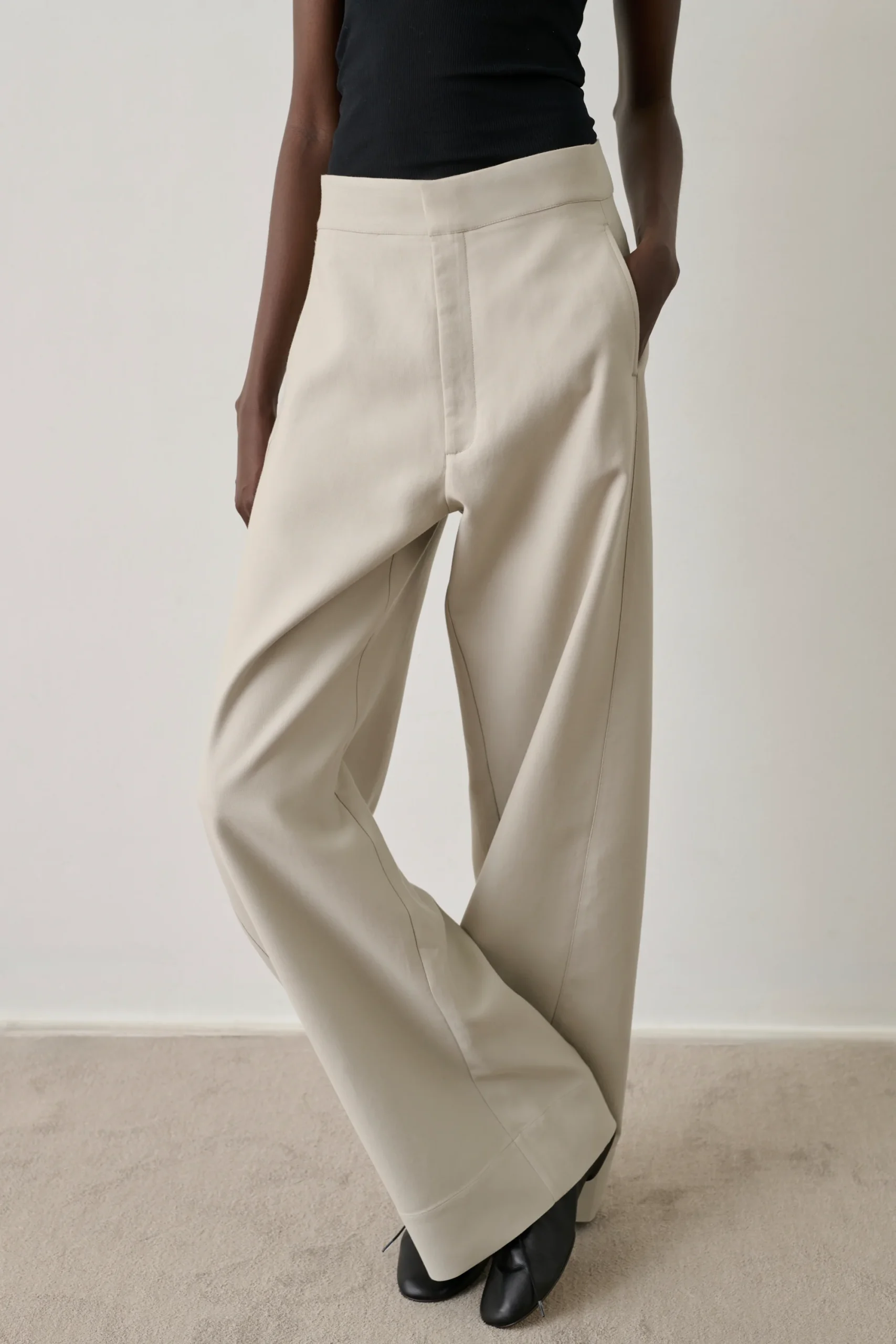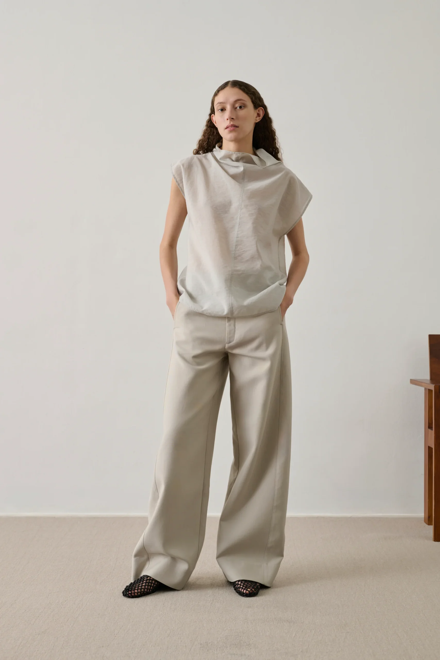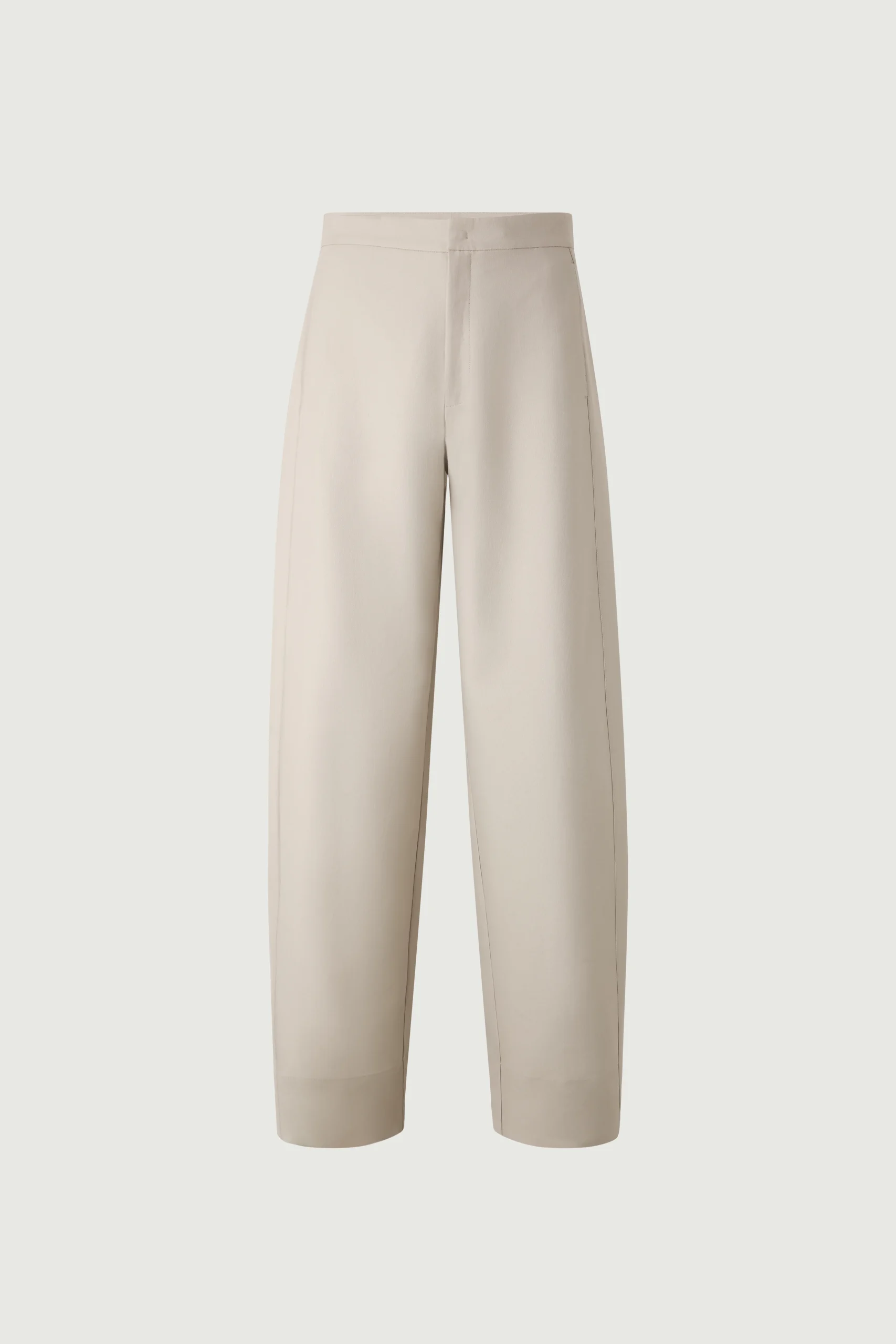 – Taille maintenue, jambes rondes et larges – Ouverture zippée avec crochet et bouton de renfort intérieur – Deux poches insérées dans les coutures côtés devant, et deux poches passepoilées au dos – Coton biologique et viscose texturée