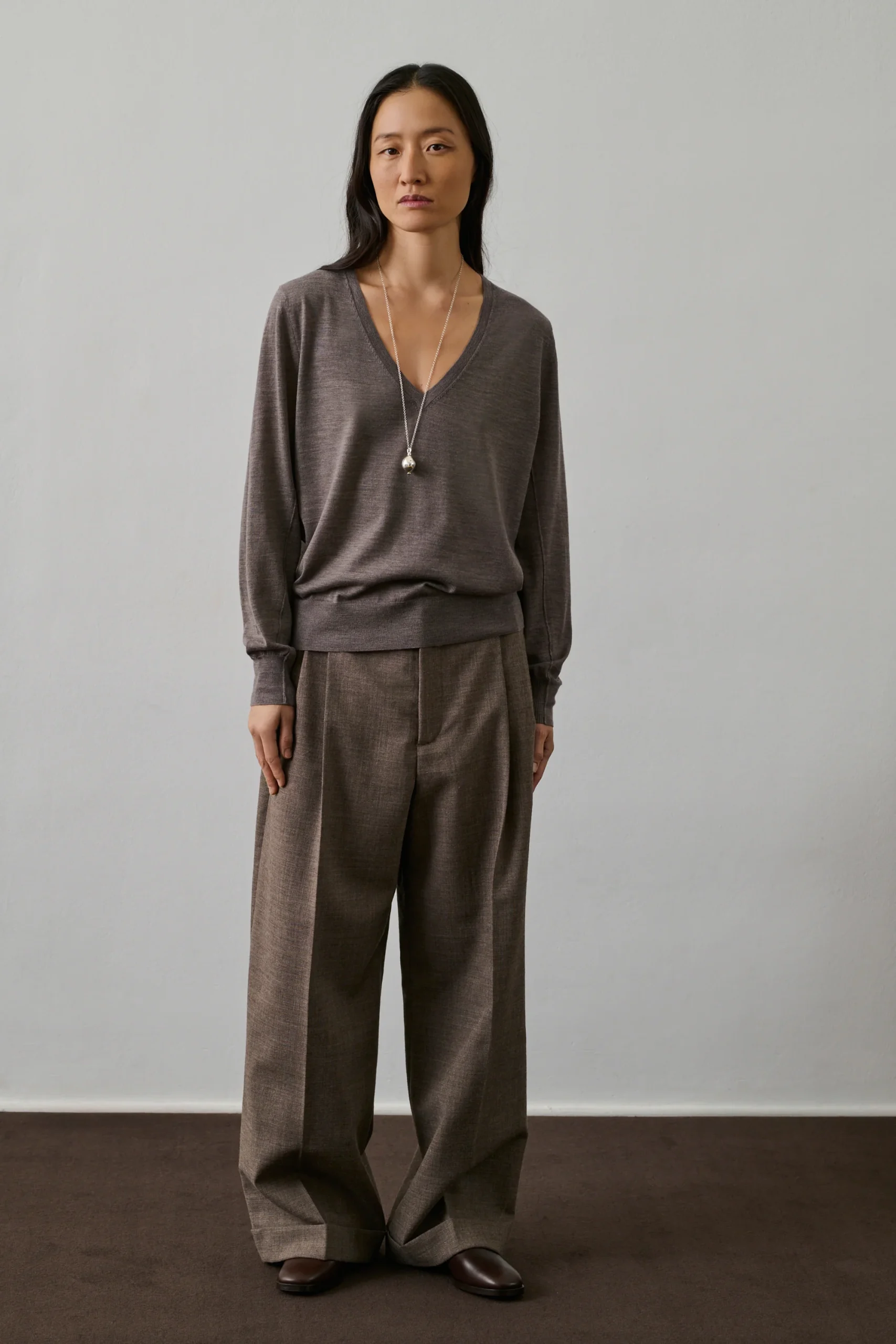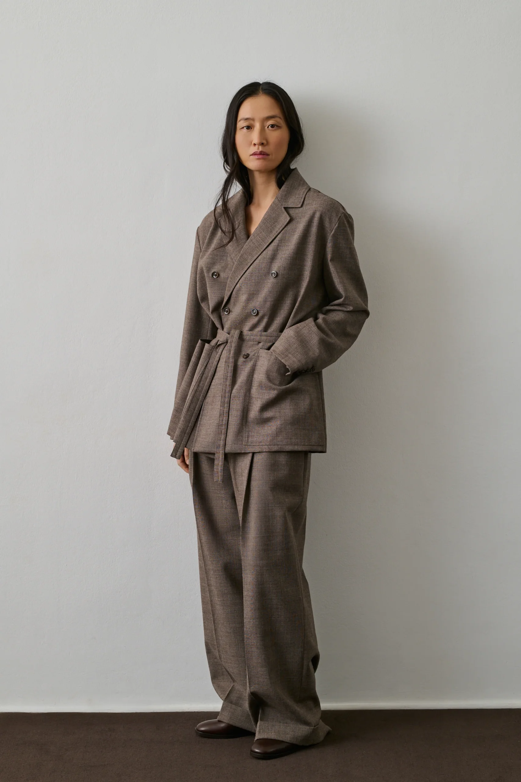 WATSON est un pantalon large en toile de laine chinée. Sa taille haute et ses jambes évasées assurent une silhouette élancée. Les poches italiennes et passepoilées complètent son allure sophistiquée.
