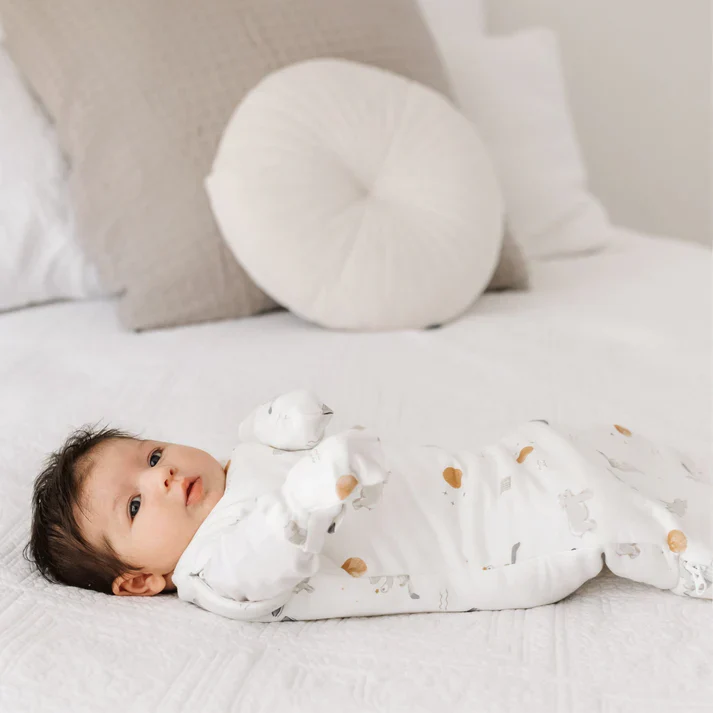 Le tissu fait à 70% de viscose de bambou et 30% de coton est idéal pour les bébés souffrants d’allergies et d’eczéma. Suffisamment de bambou pour garder les propriétés de cette fibre unique et juste assez de coton pour accroître sa durabilité. Le confort de bébé est garanti! Design canadien.