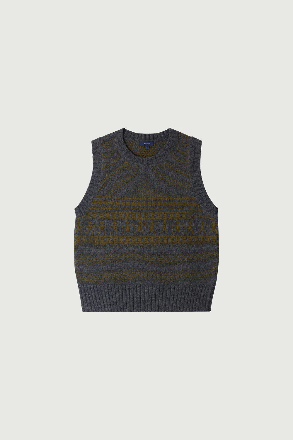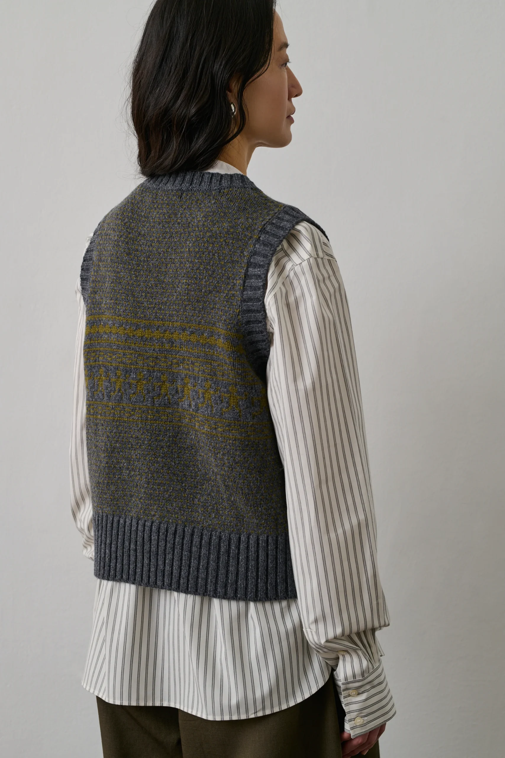 NAMASTE est un pull sans manches en laine, souple et confortable. À porter seul ou en superposition. Pratique, il se glisse sous une veste ou un manteau pour réchauffer sans contraindre le mouvement des bras. – Coupe droite– Sans manches – Col rond– Jacquard– Laine mérinos