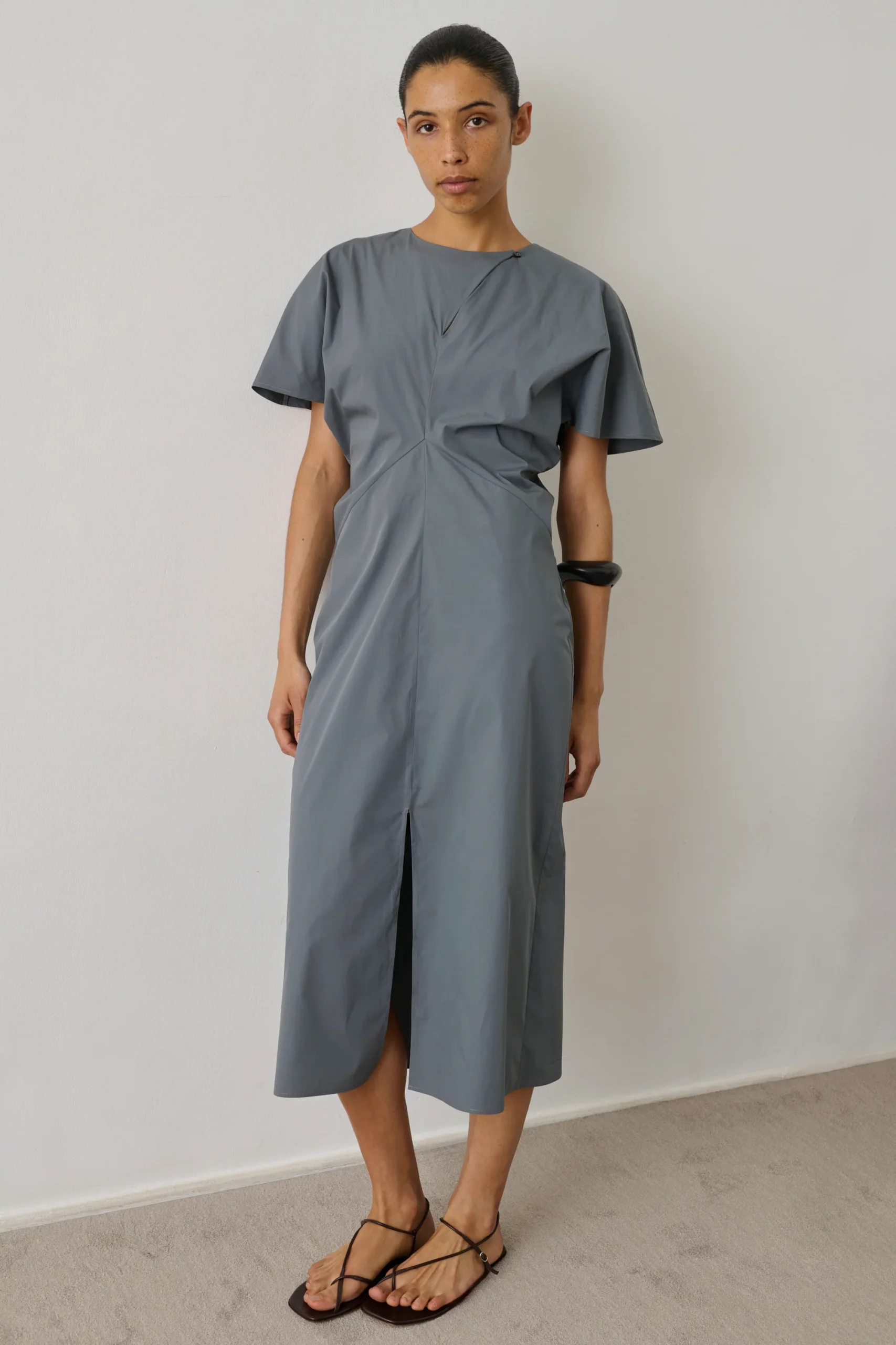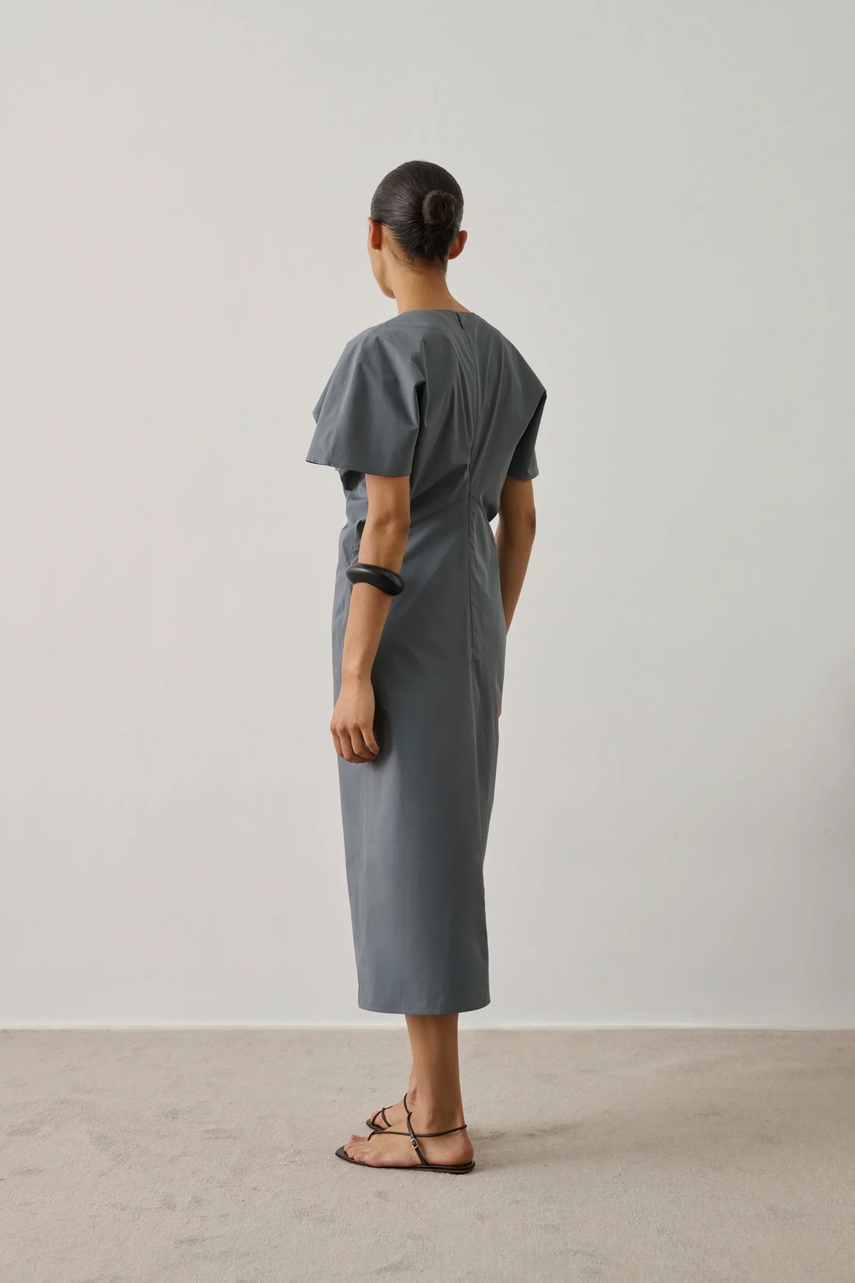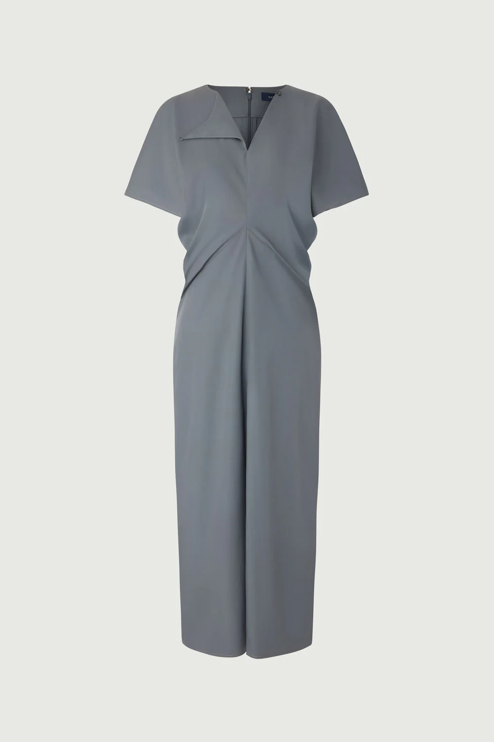 – Légèrement ajustée à la taille, évasée vers le bas – Longueur mi-mollet – Ouverture dos zippée invisible et petit crochet – Fente en bas devant – Détail de drapé