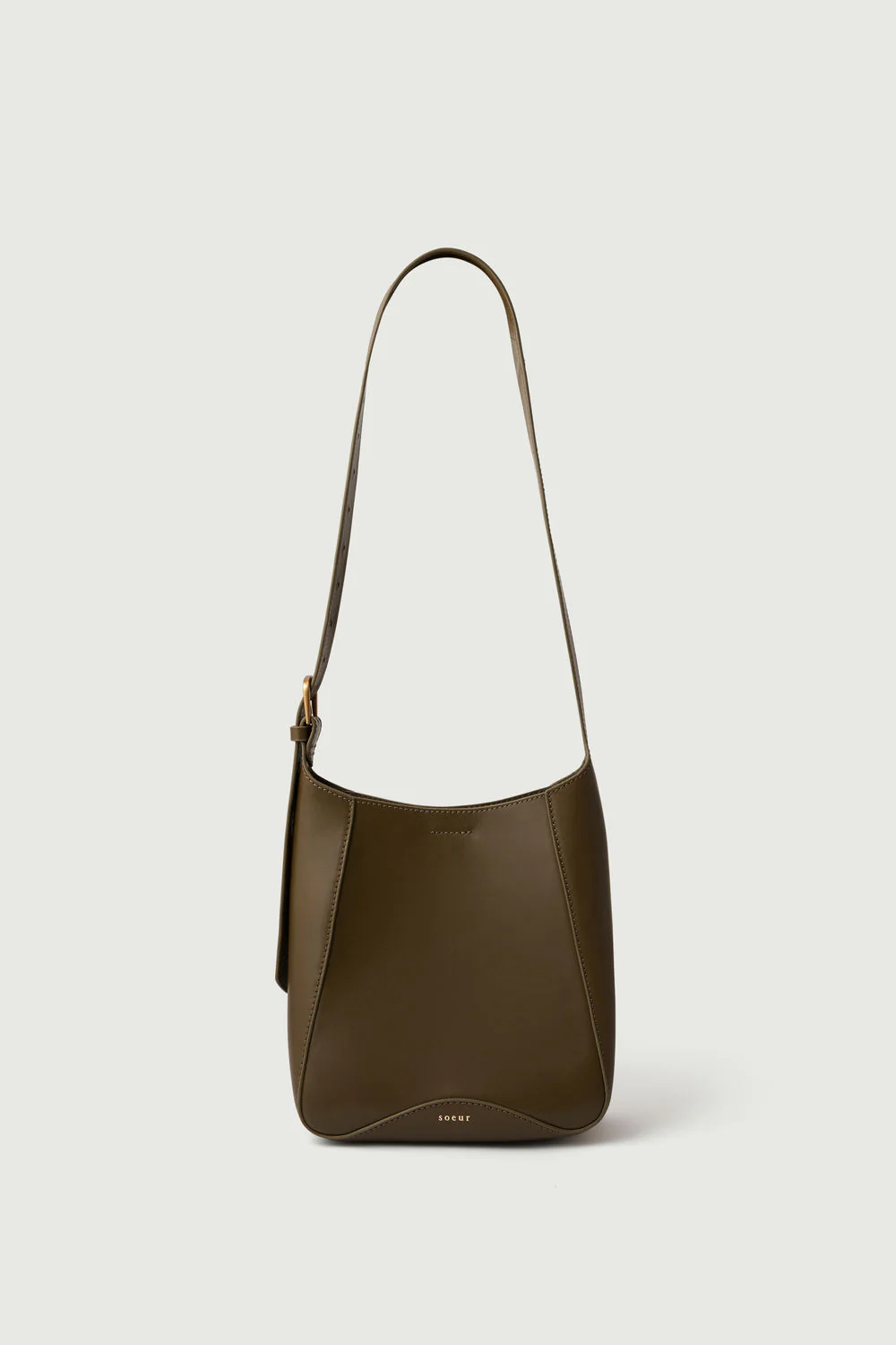 – Petit sac en cuir lisse kaki – Dimensions : hauteur 22cm, largeur 22cm, profondeur 10cm – Bandoulière ajustable de flèche minimale 26cm et flèche maximale 43cm – Fermeture magnétique – Une poche plaquée intérieure – Métallerie dorée – Cuir LWG (Leather Working Group)