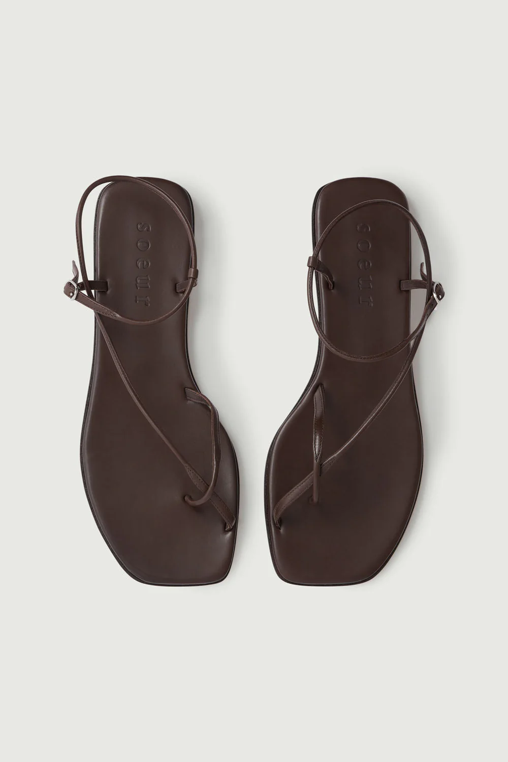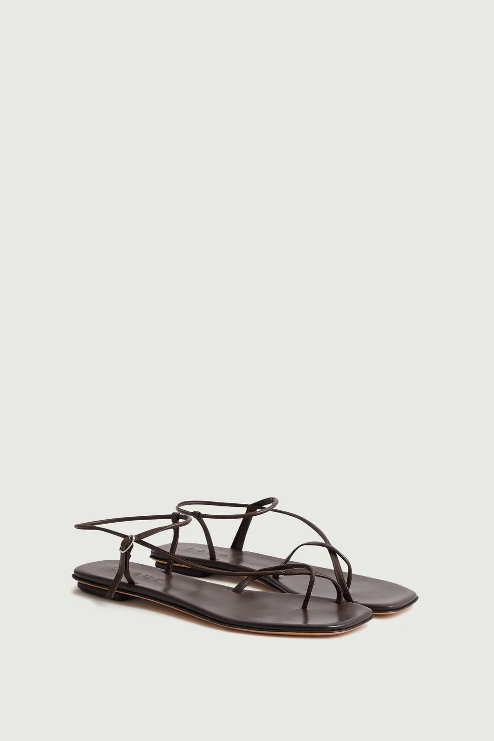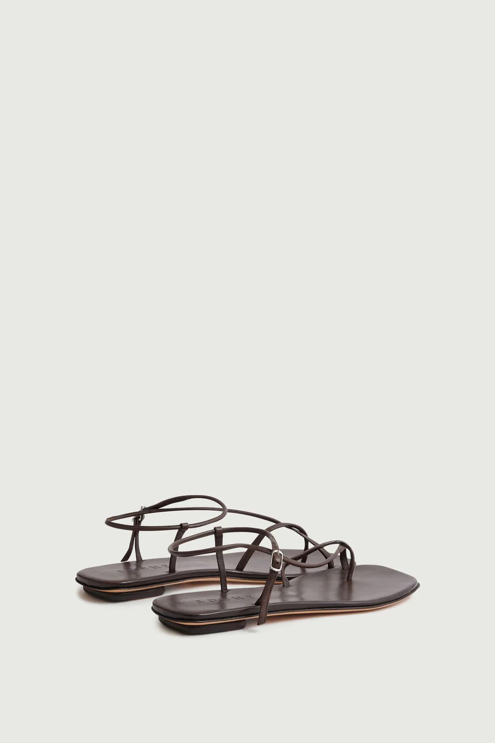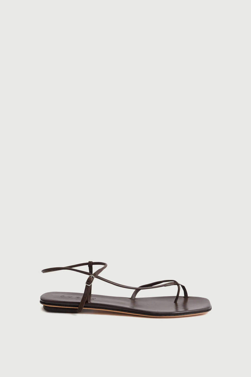 – Sandales plates en cuir marron – Hauteur de talon 14mm – Ouverture par bride ajustable à la cheville – Métallerie argentée – Cuir LWG (Leather Working Group)