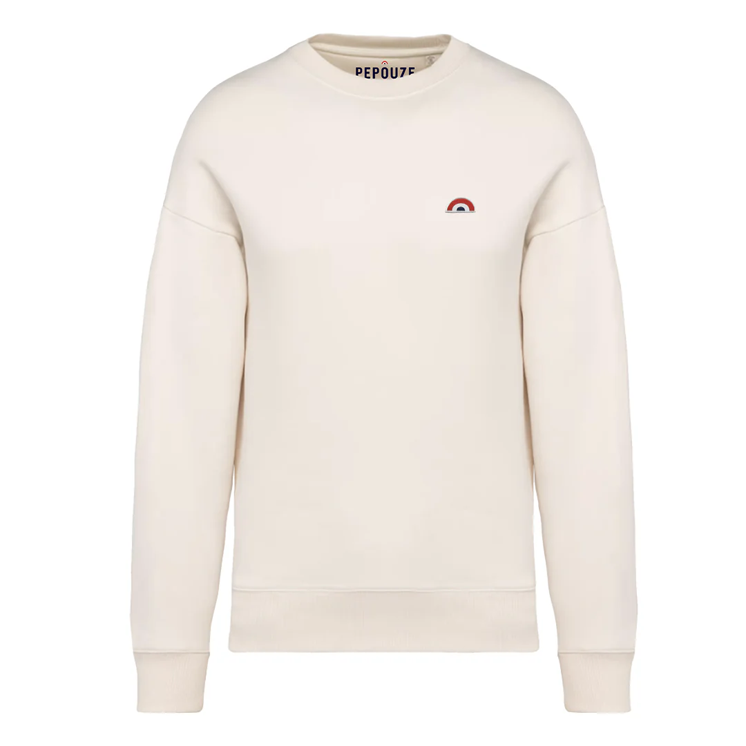 Ce Sweat Enfant Arc-en-Ciel Ivoire (350g) avec le logo Pepouze Culture en patch tissé placé au niveau de la poitrine, avec à l’arrière sa petite étiquette tissée également en arc-en-ciel bleu, blanc, rouge est un basic de la collection automne hiver.