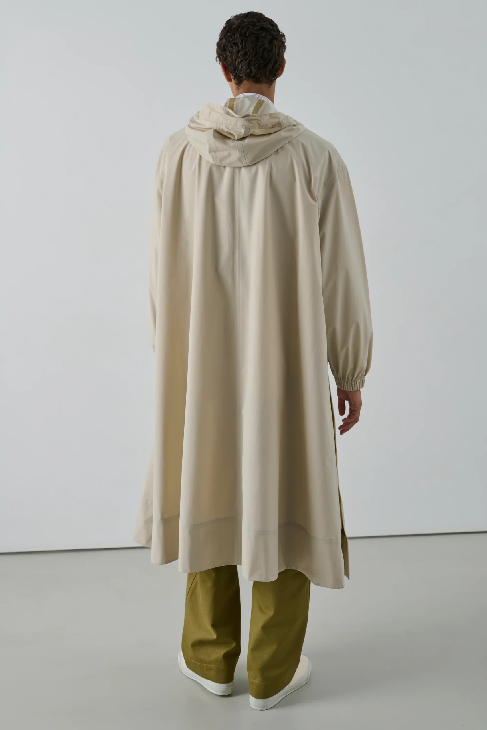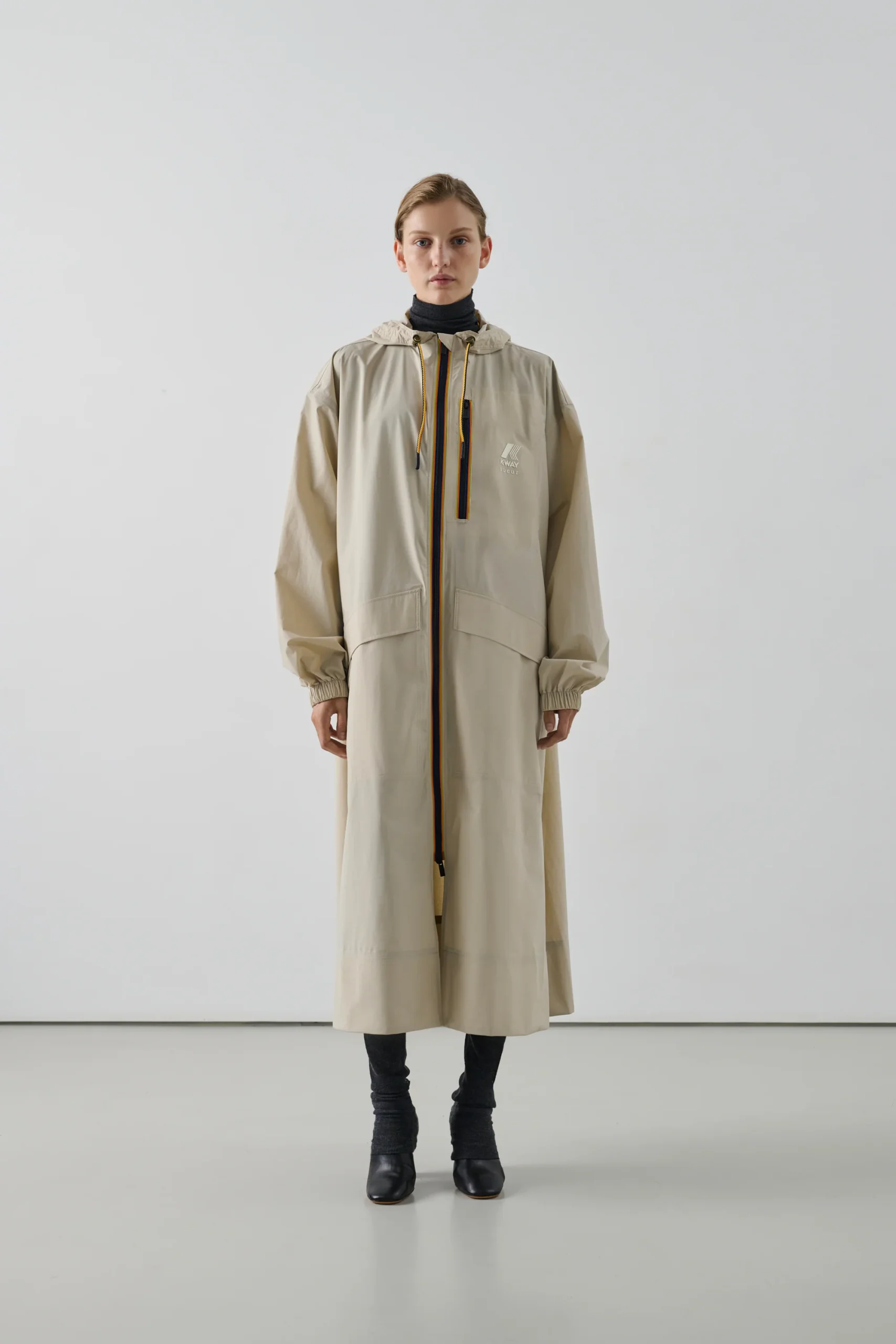 PRADEL est un trench hybride entre parka et trench à capuche. Son volume trapèze oversize se porte même par-dessus un manteau, avec coutures thermosoudées pour une étanchéité parfaite. Les pressions aux côtés facilitent l’accès aux poches, et les manches sont resserrées par un élastique qui prévient du froid et de l’eau.